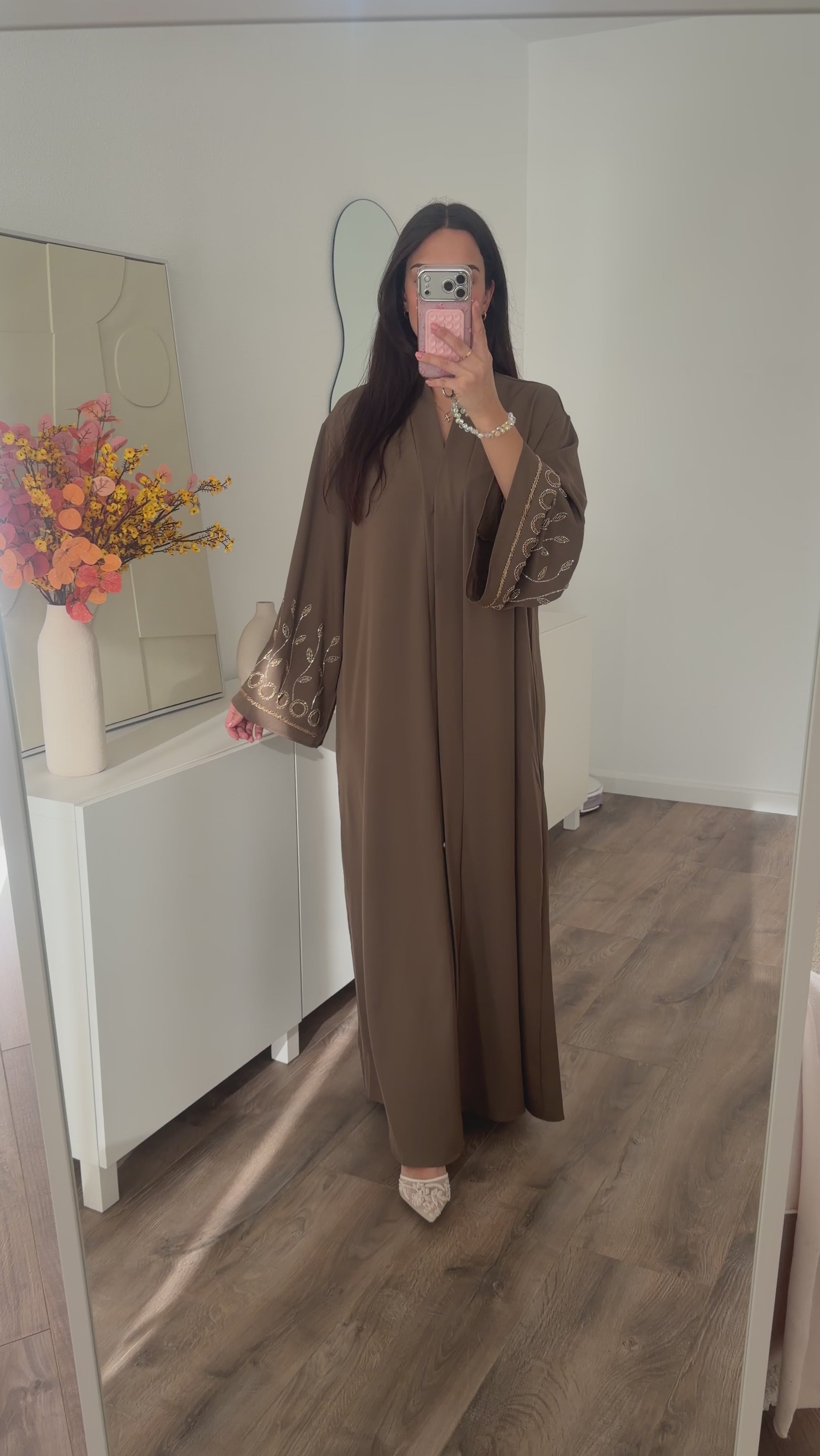Een lange abaya van fijn stofmateriaal. De abaya schijnt niet door en sluit met knopen aan de voorkant. De abaya heeft mooie opvallende steentjes op de mouwen. Dit item valt ruim. Bij een tussenmaat wordt een maat kleiner aanbevolen. Eventueel hijabproof. Geschikt bij zwangerschap. Let op wasvoorschrift: handwas i.v.m. delicate samenstelling!