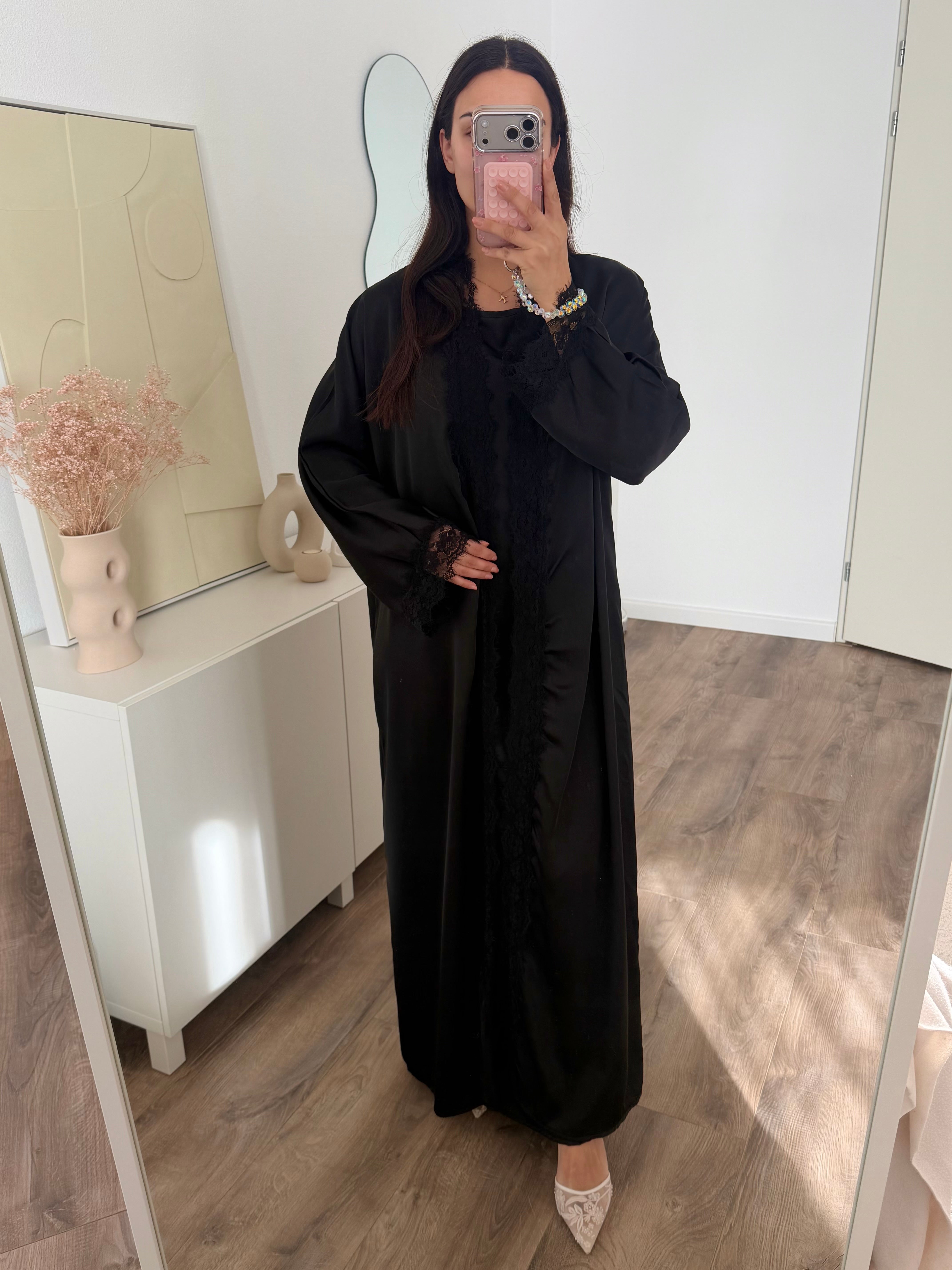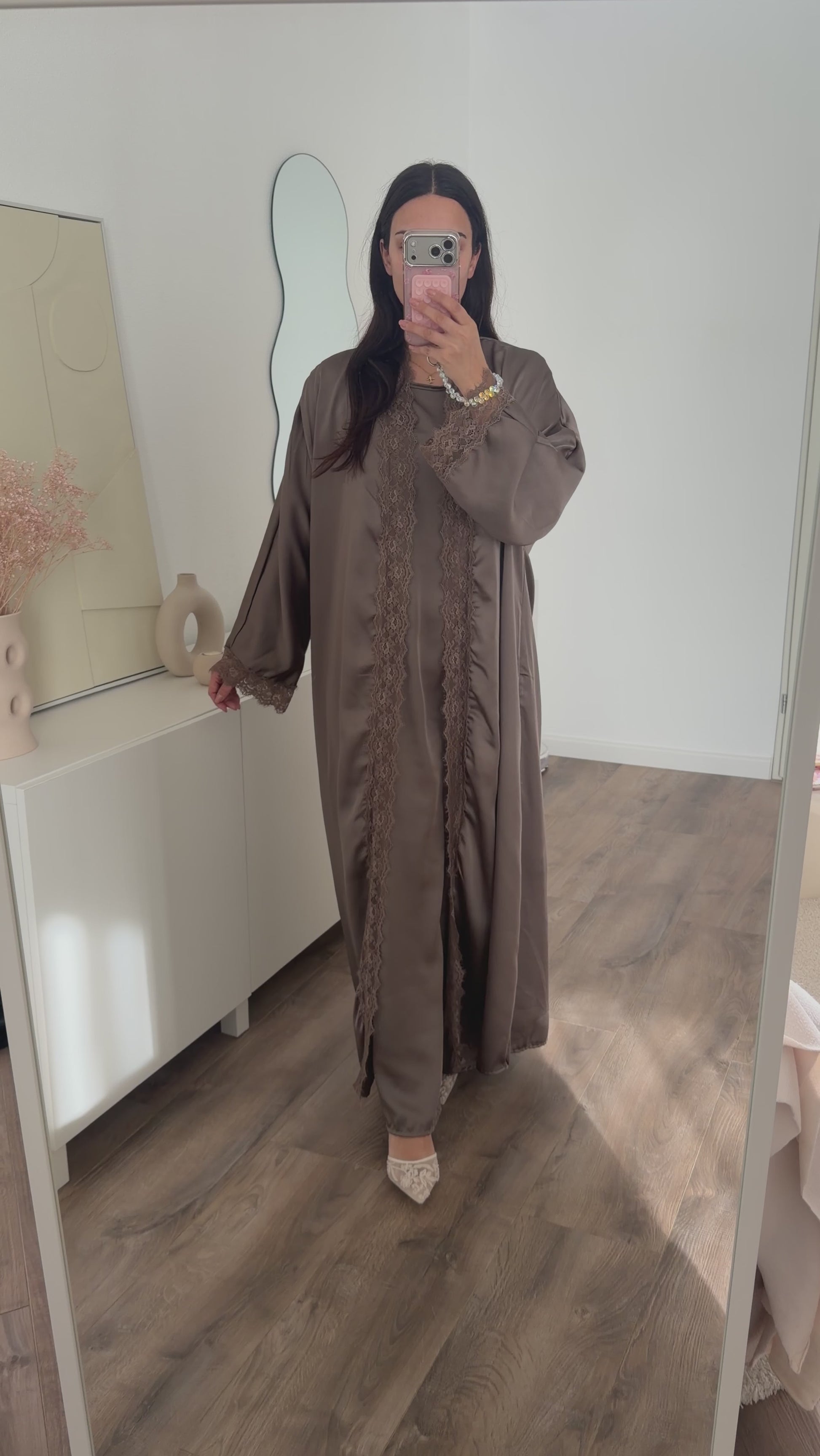 Een set bestaande uit mouwloze onderjurk en kimono met satijnen look. De set schijnt niet door. De kimono heeft kanten details aan de voorkant en op de mouwen. De onderjurk is getailleerd te dragen door de koordjes aan de achterkant. Dit item is een one size maat en wordt aanbevolen van maat XS(34) t/m XL(42). De set valt ruim. Hijabproof. Geschikt bij zwangerschap.