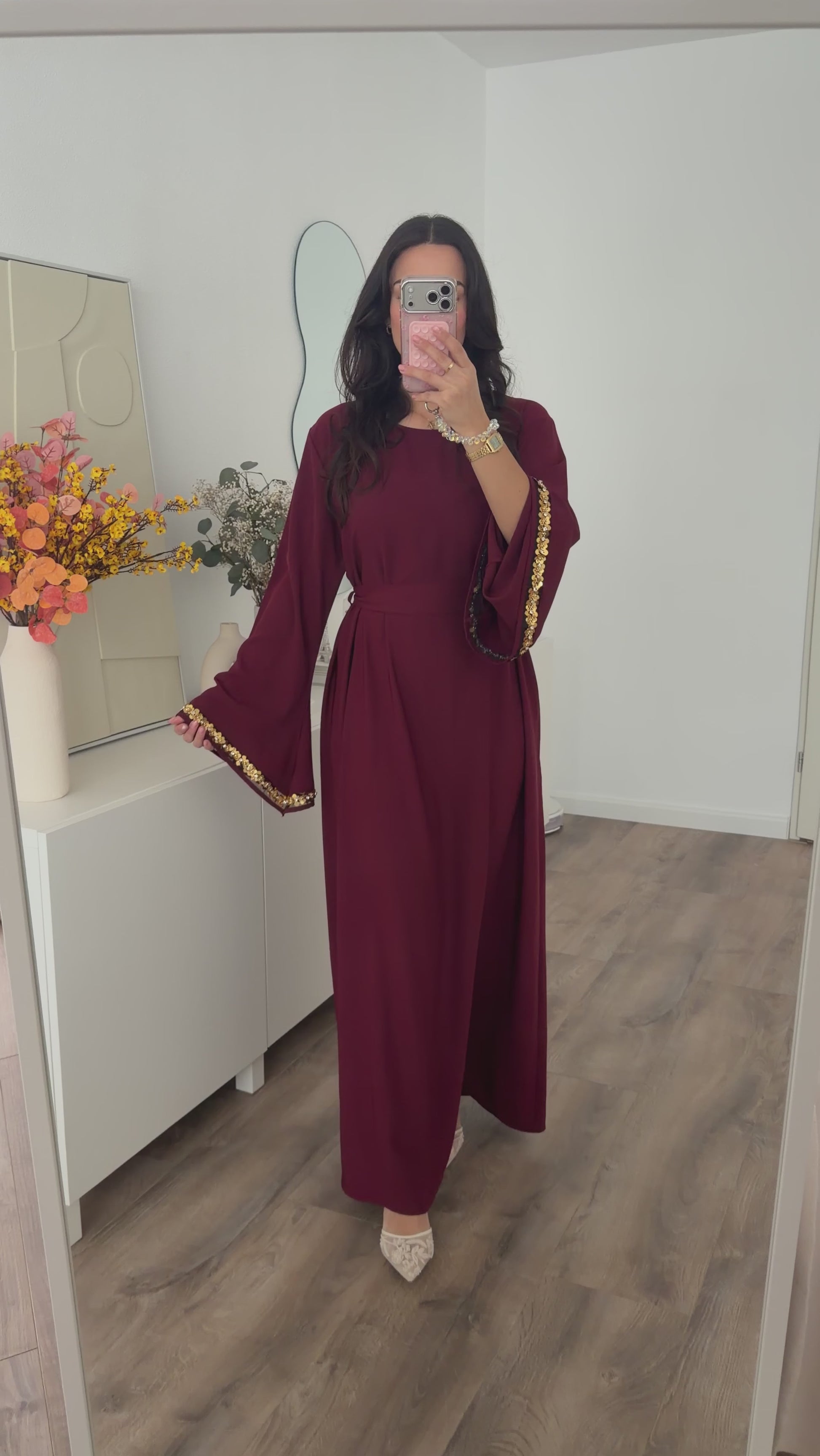 Een abaya van fijne soepelvallende stofkwaliteit. De abaya schijnt niet door. De pailletten op de mouwen geven de abaya een leuke feestelijke look. Dit item is een one size maat en wordt aanbevolen van maat S(36) t/m XL(42). De abaya valt ruim. Hijabproof. Geschikt bij zwangerschap.