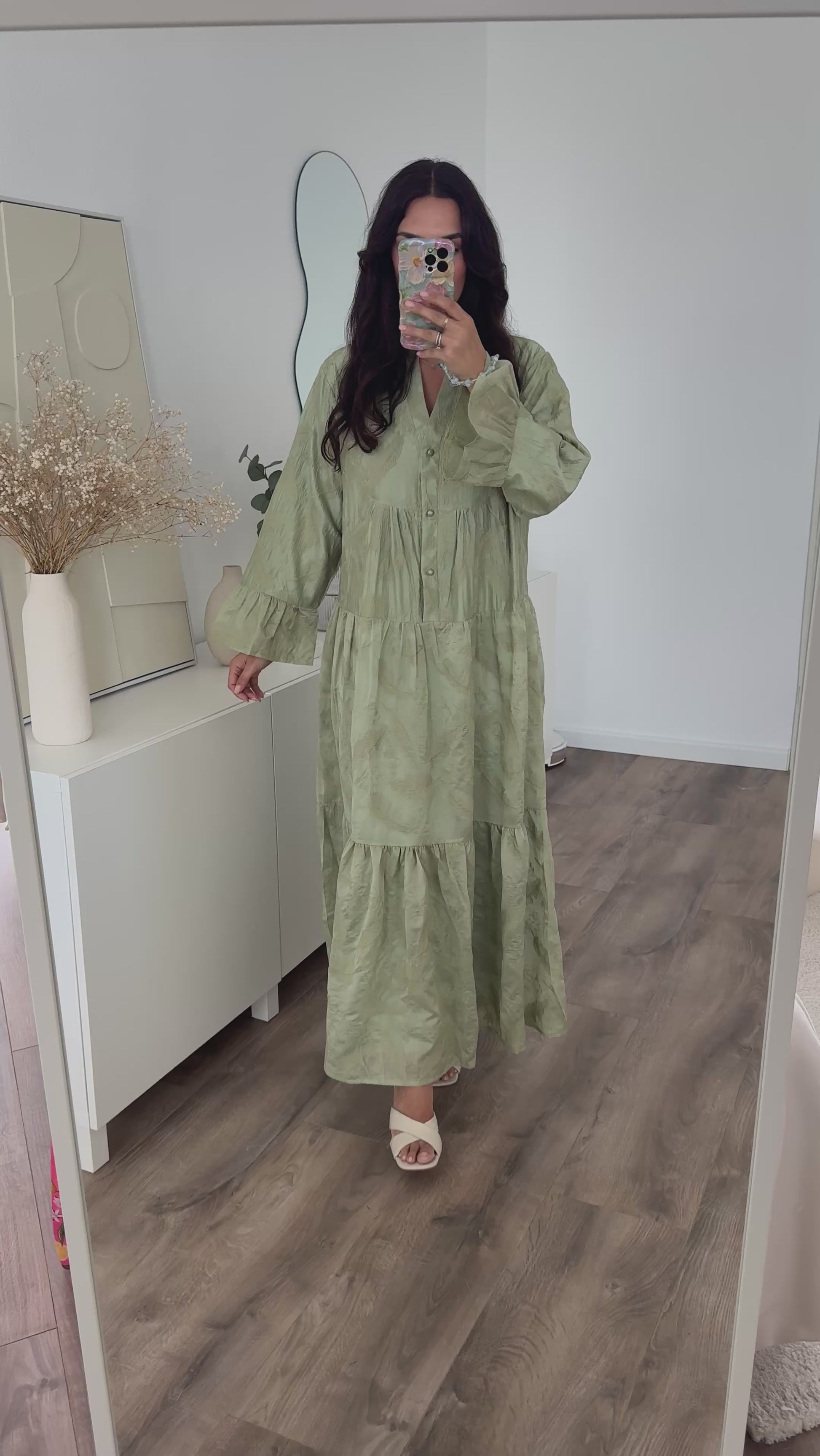 Een lange voor de zomer van fijne stofkwaliteit. De lichte kleuren kunnen licht doorschijnen. De jurk heeft een onderjurk. De jurk sluit met knopen tot de buik. De patronen geven de jurk extra detail. Dit item valt luchtig. Bij een tussenmaat is een maat groter aanbevolen. Geschikt bij zwangerschap. Eventueel hijabproof.