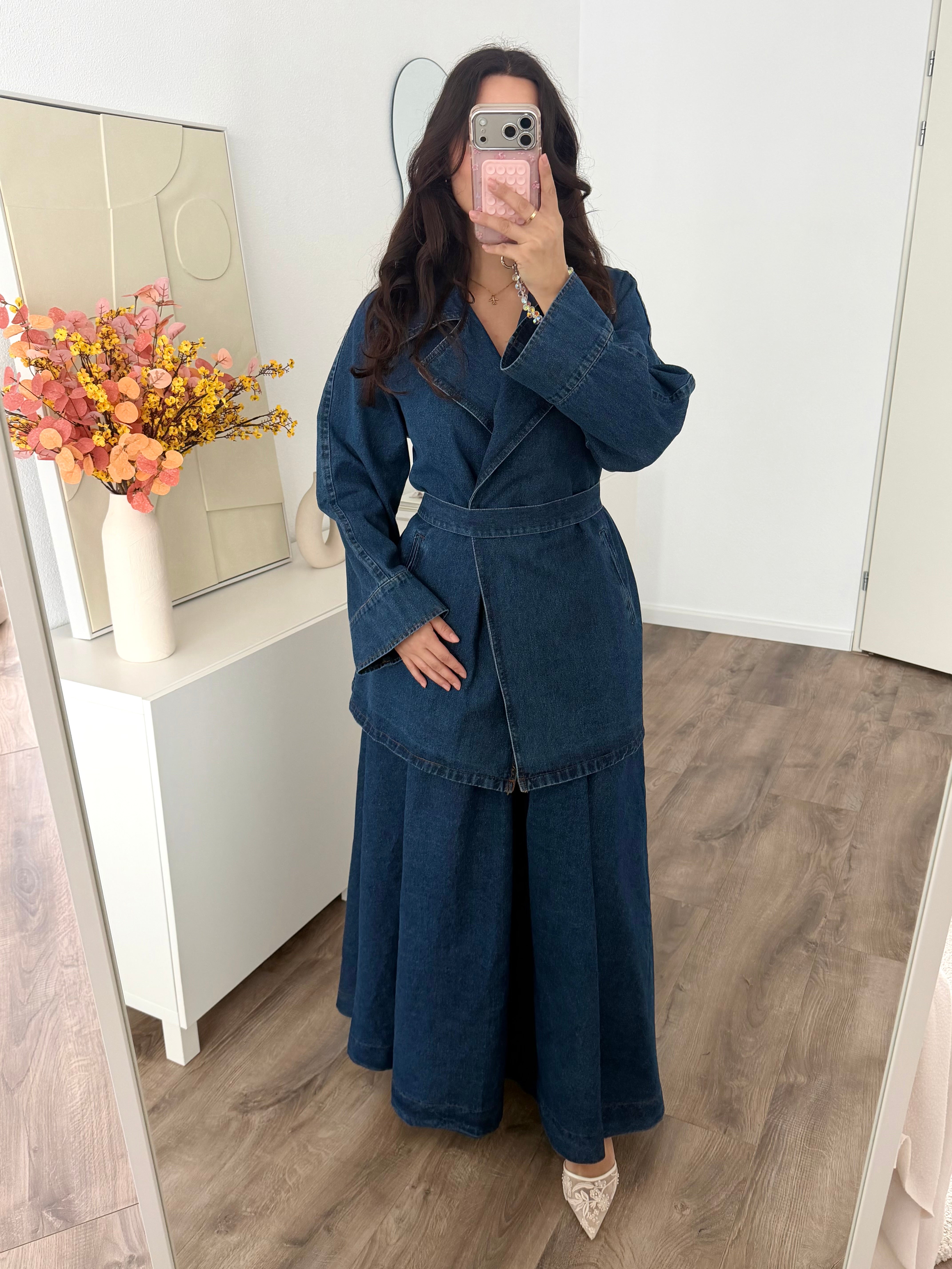 Een tweedelige set van stevige spijkerstof. De set schijnt niet door. De bovenkant sluit met een knoop en heeft een riem. De rok heeft een elastische taille. Dit item valt ruim. Hijabproof. Eventueel geschikt bij zwangerschap.