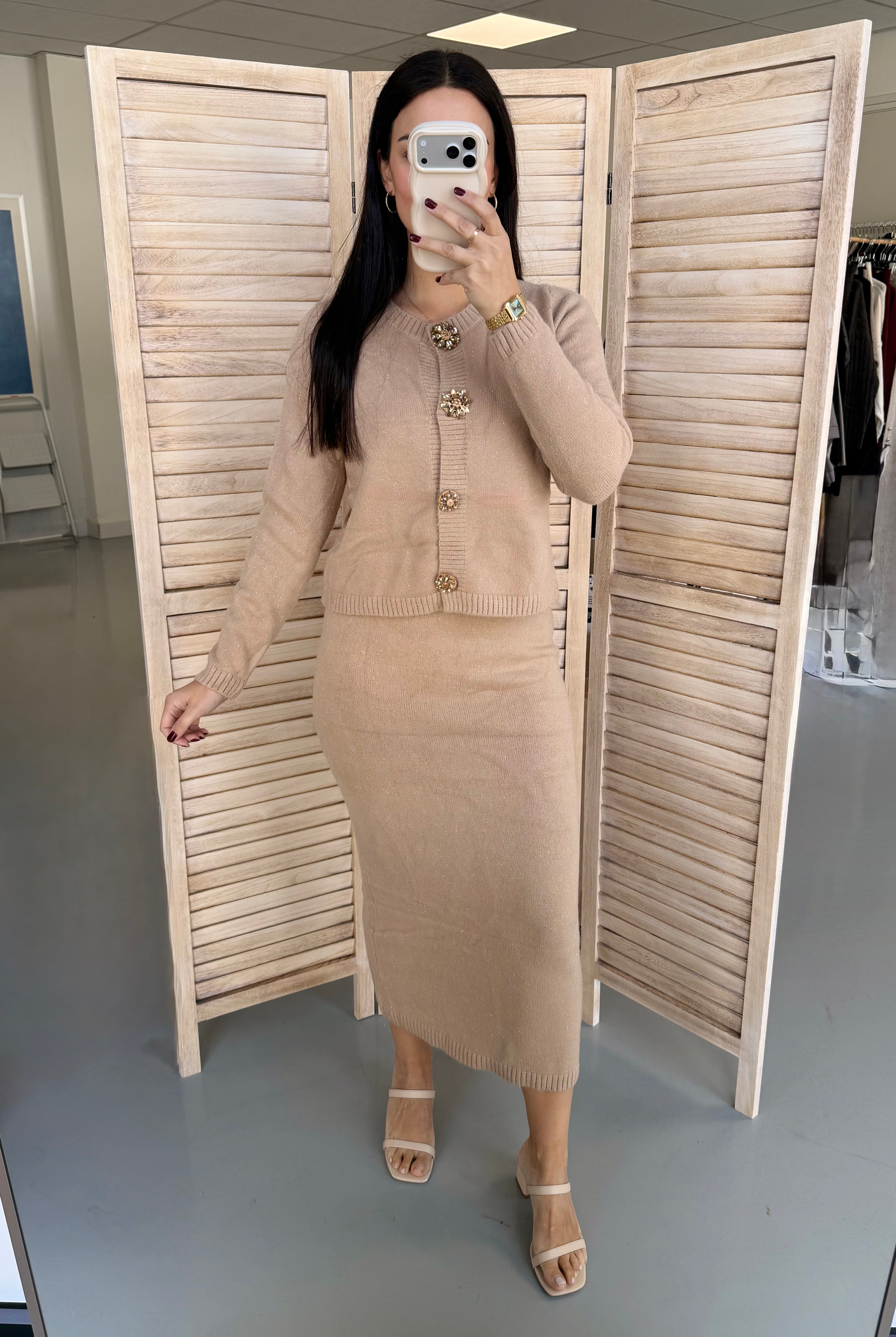 Een tweedelige set van fijne stofkwaliteit. De set schijnt niet door. De stof heeft kleine glimmende details. Het vest heeft mooie opvallende knopen met diamantjes. Dit item valt op maat. De set rekt een beetje mee.
