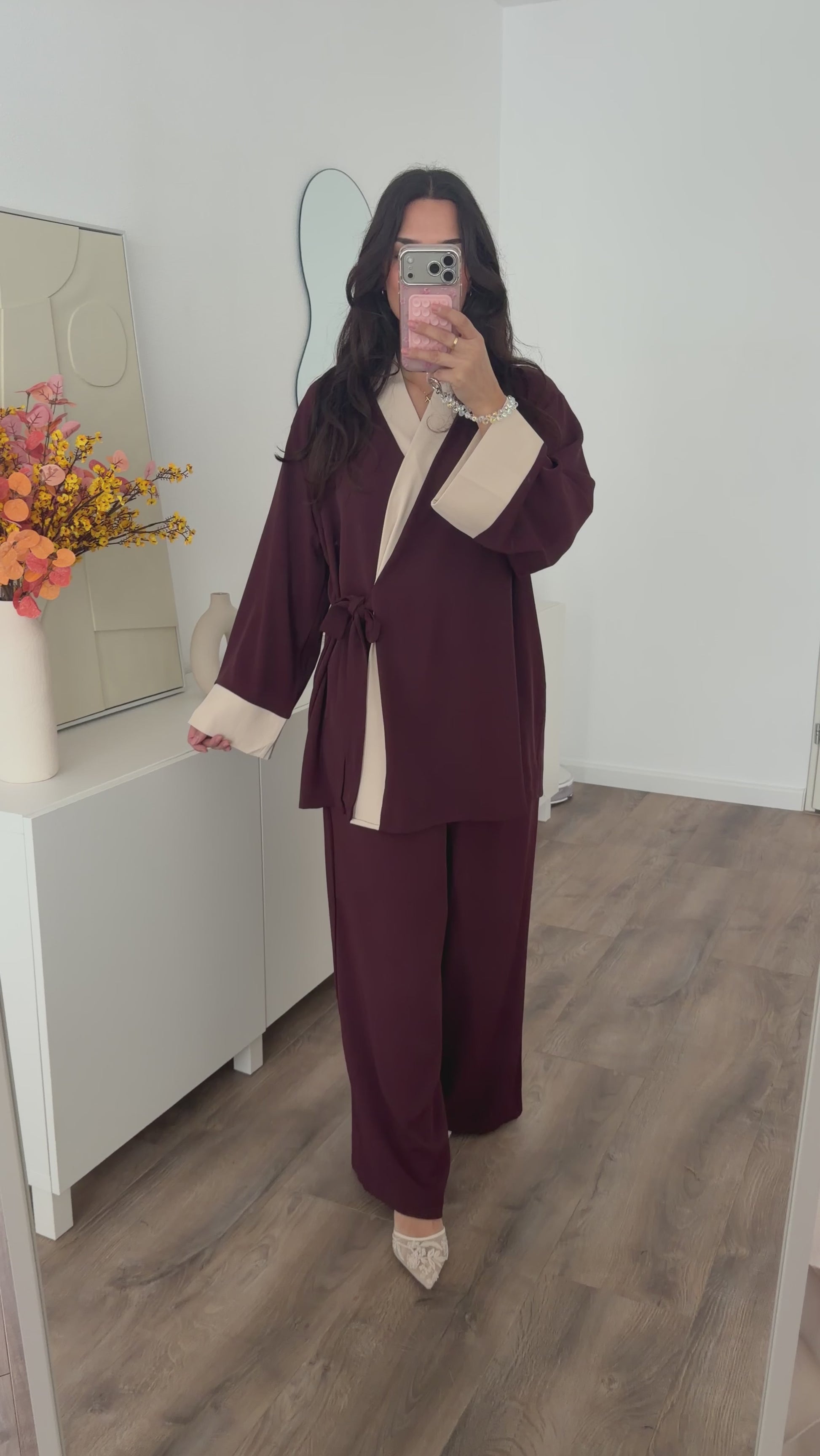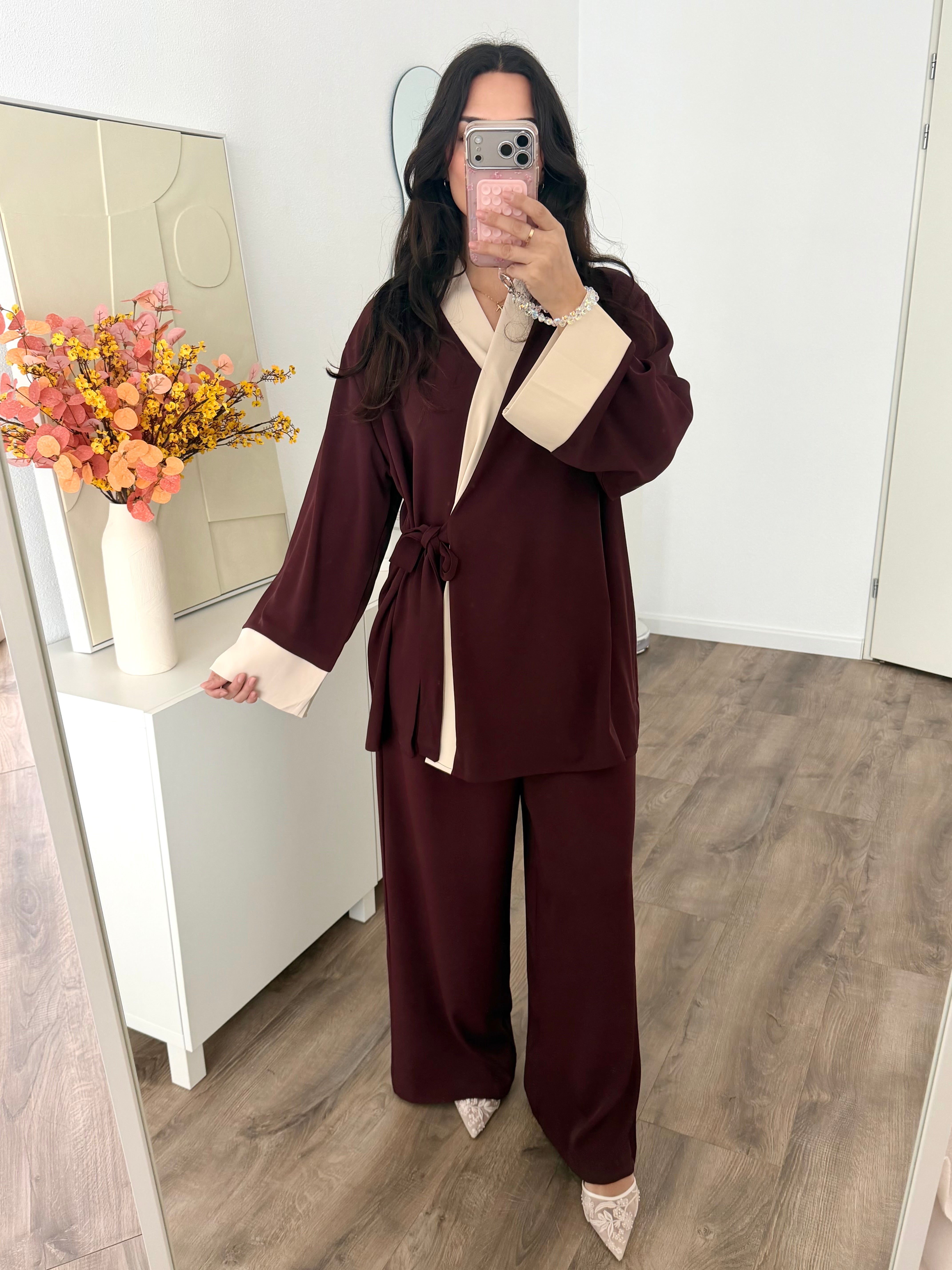 Een tweedelige set van stevig soepelvallend stofmateriaal. De set schijnt niet door. De blouse heeft een omslag en de broek heeft een elastische taille en zakken. Dit item valt ruim. Eventueel hijabproof en/of geschikt bij zwangerschap.
