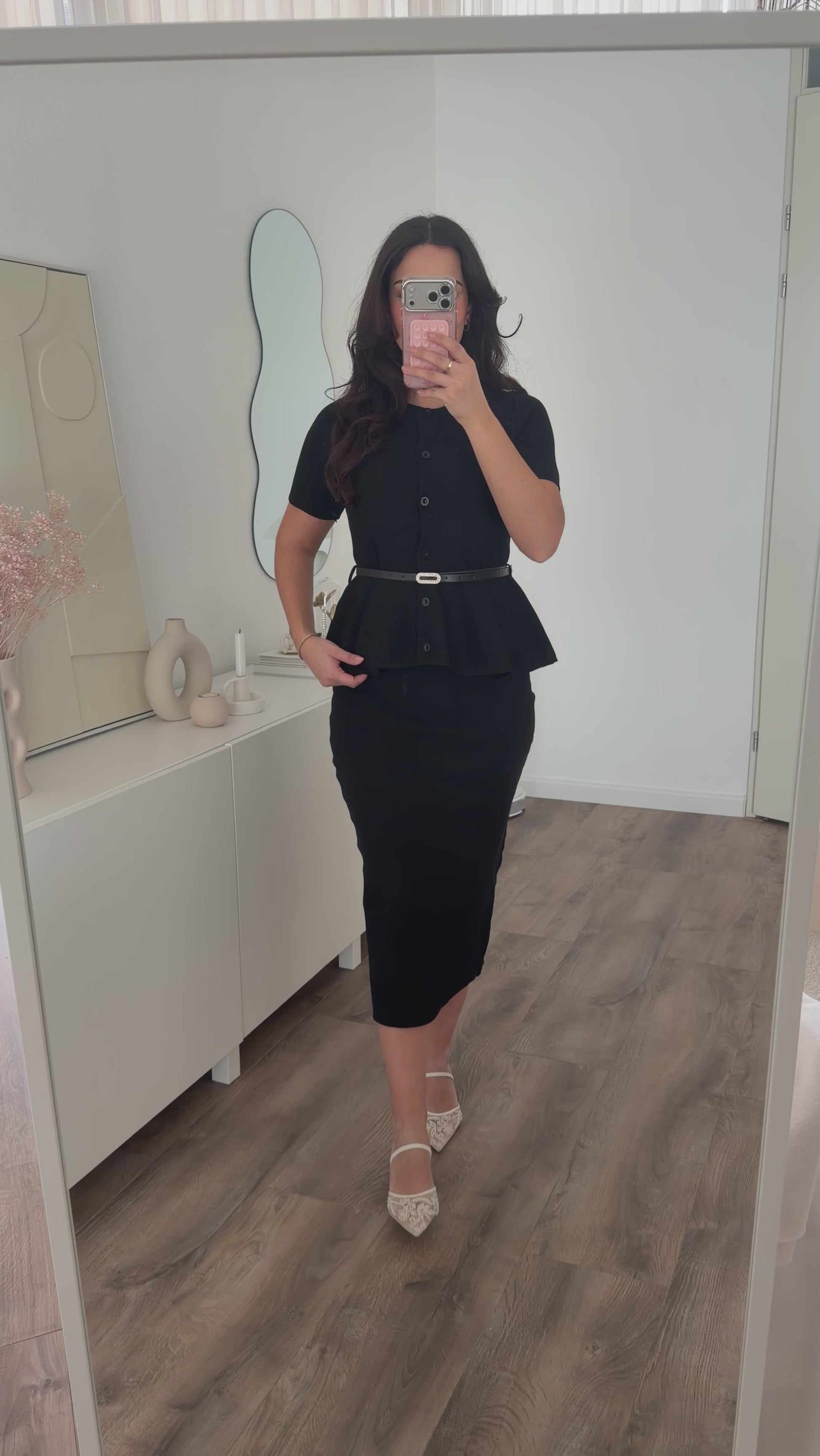 Een tweedelige set van fijne stofkwaliteit. De set schijnt niet door; bij de witte kleur is neutrale kleur ondergoed aanbevolen. De bovenkant heeft licht ruffes. De rok heeft een korte split aan de achterkant. De riem is inbegrepen bij de set. Dit item is elastisch en valt op maat.
