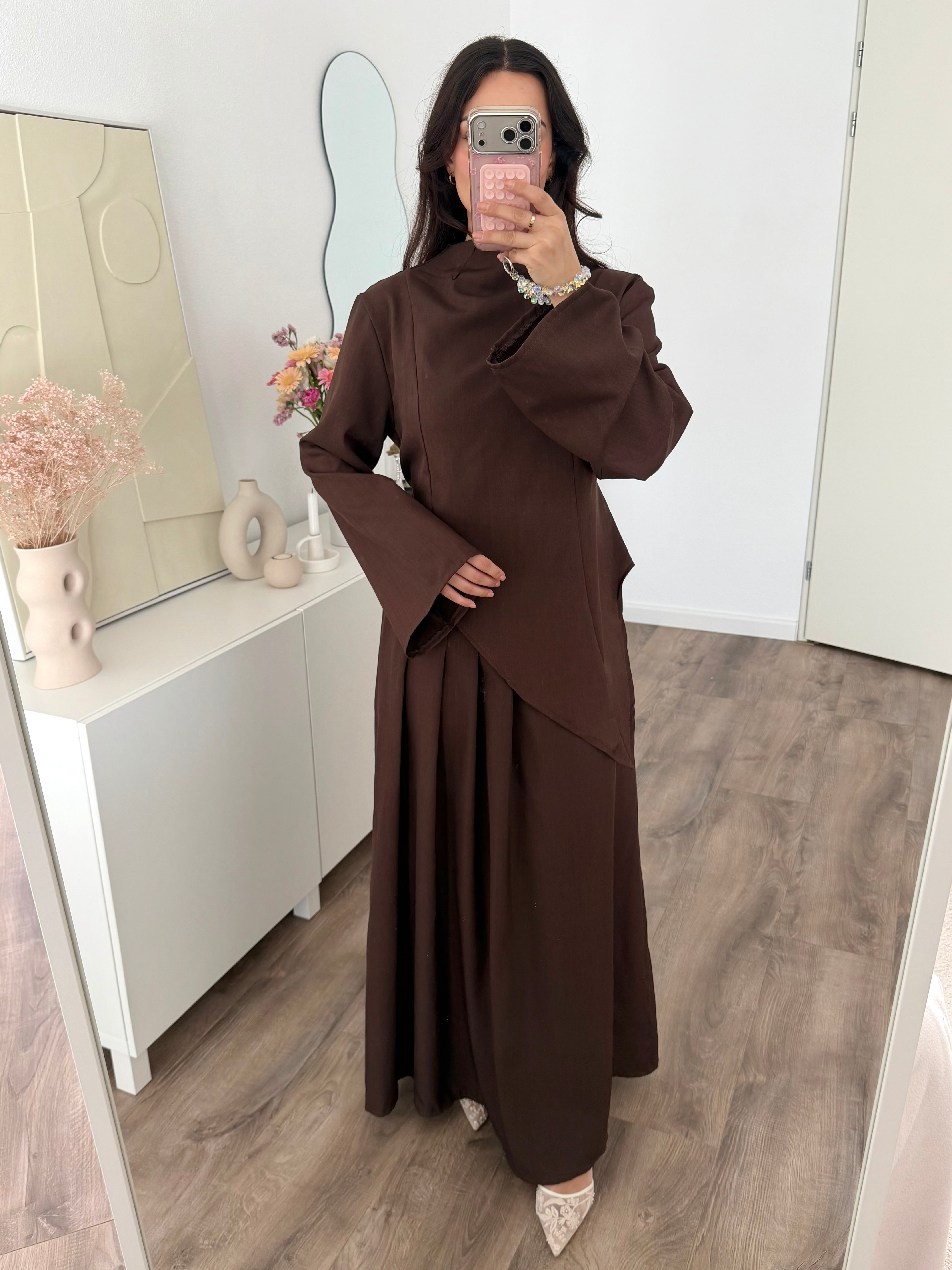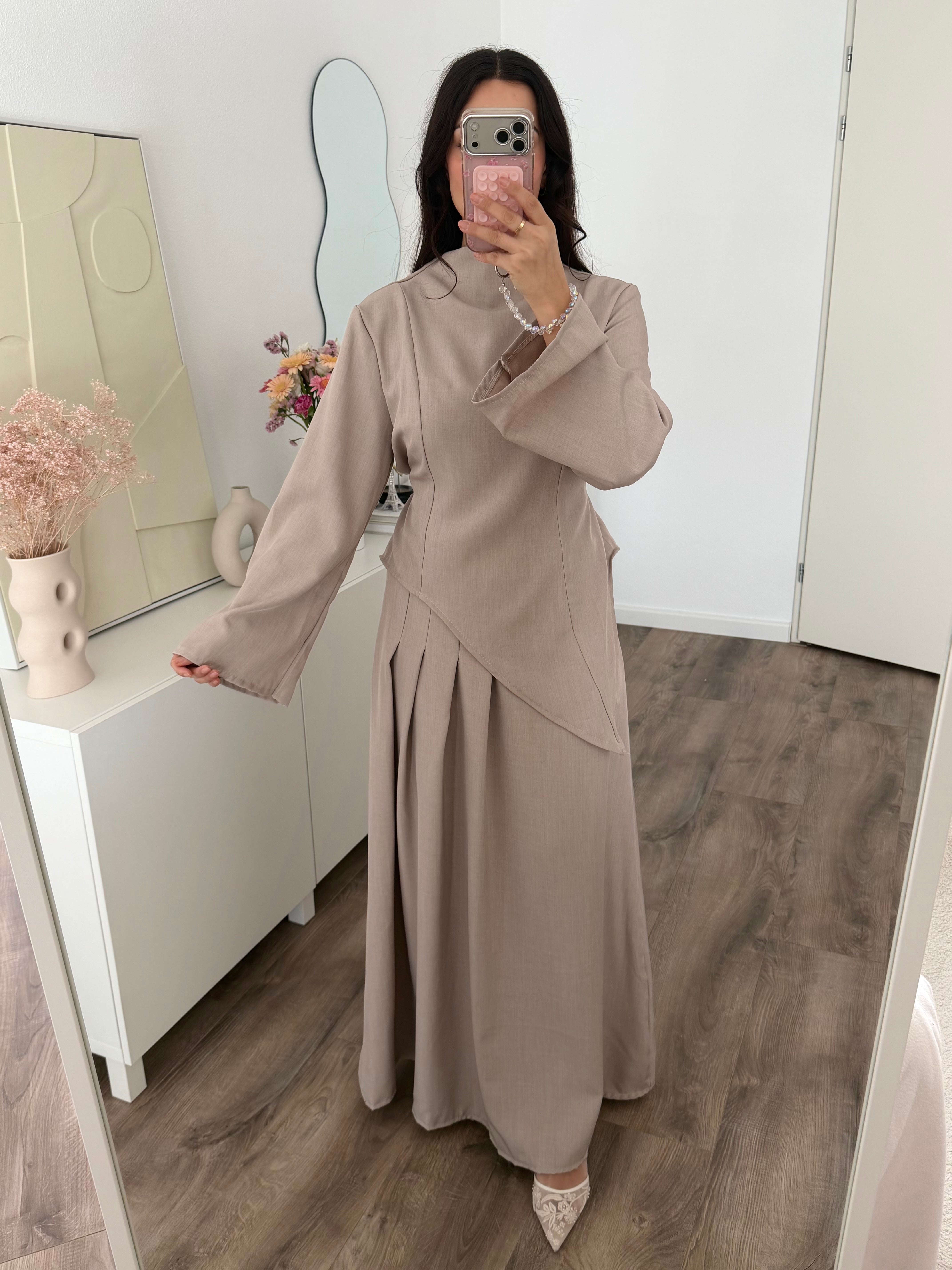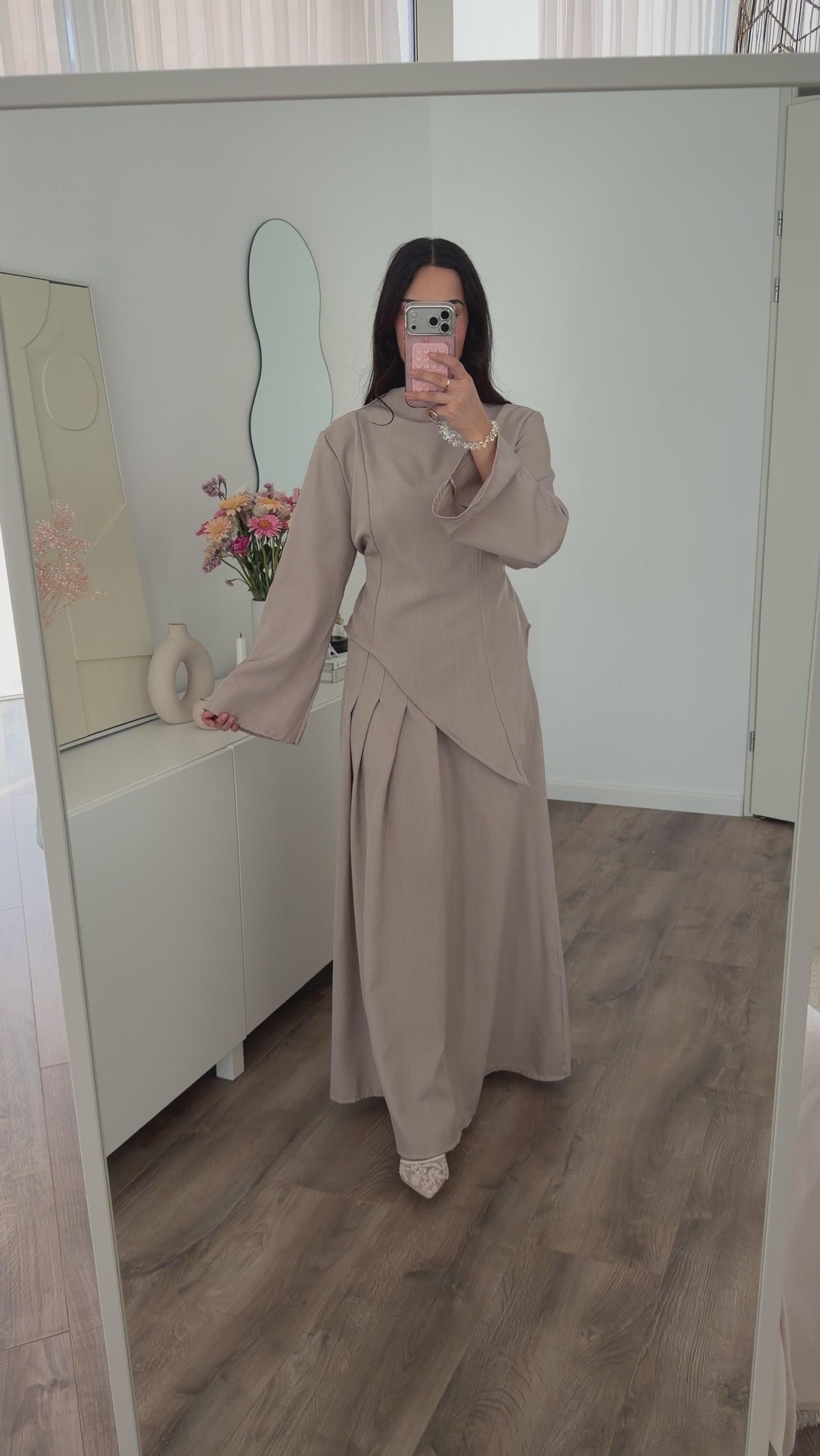 Een tweedelige set bestaande uit blouse en rok. De set schijnt niet door. De blouse heeft een asymmetrische onderkant en koordjes aan de achterkant voor meer taille. De rok heeft een elastische taille. Dit item is een kleine one size maat en wordt aanbevolen van maat XS(34) t/m L(40). Hijabproof.
