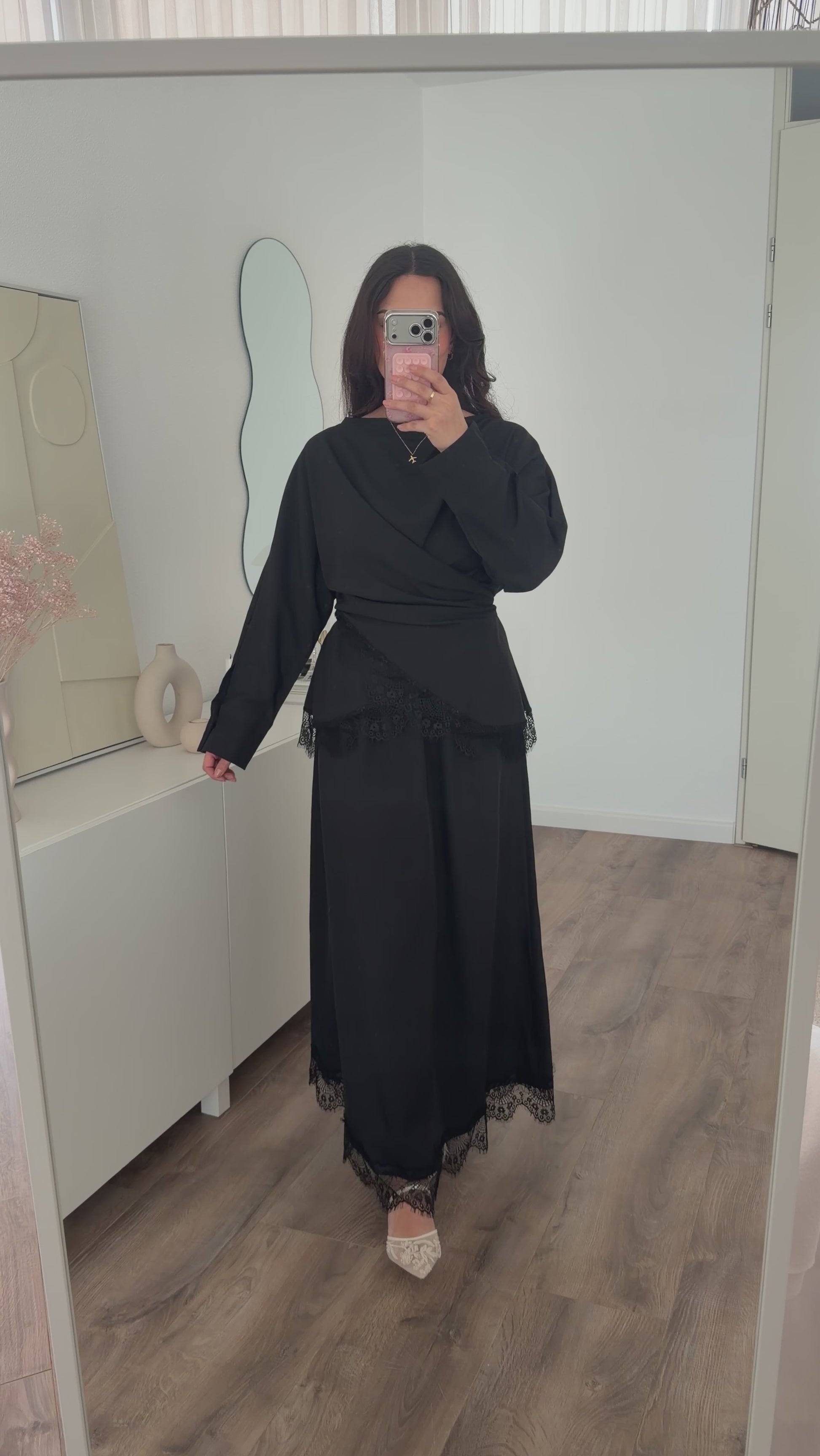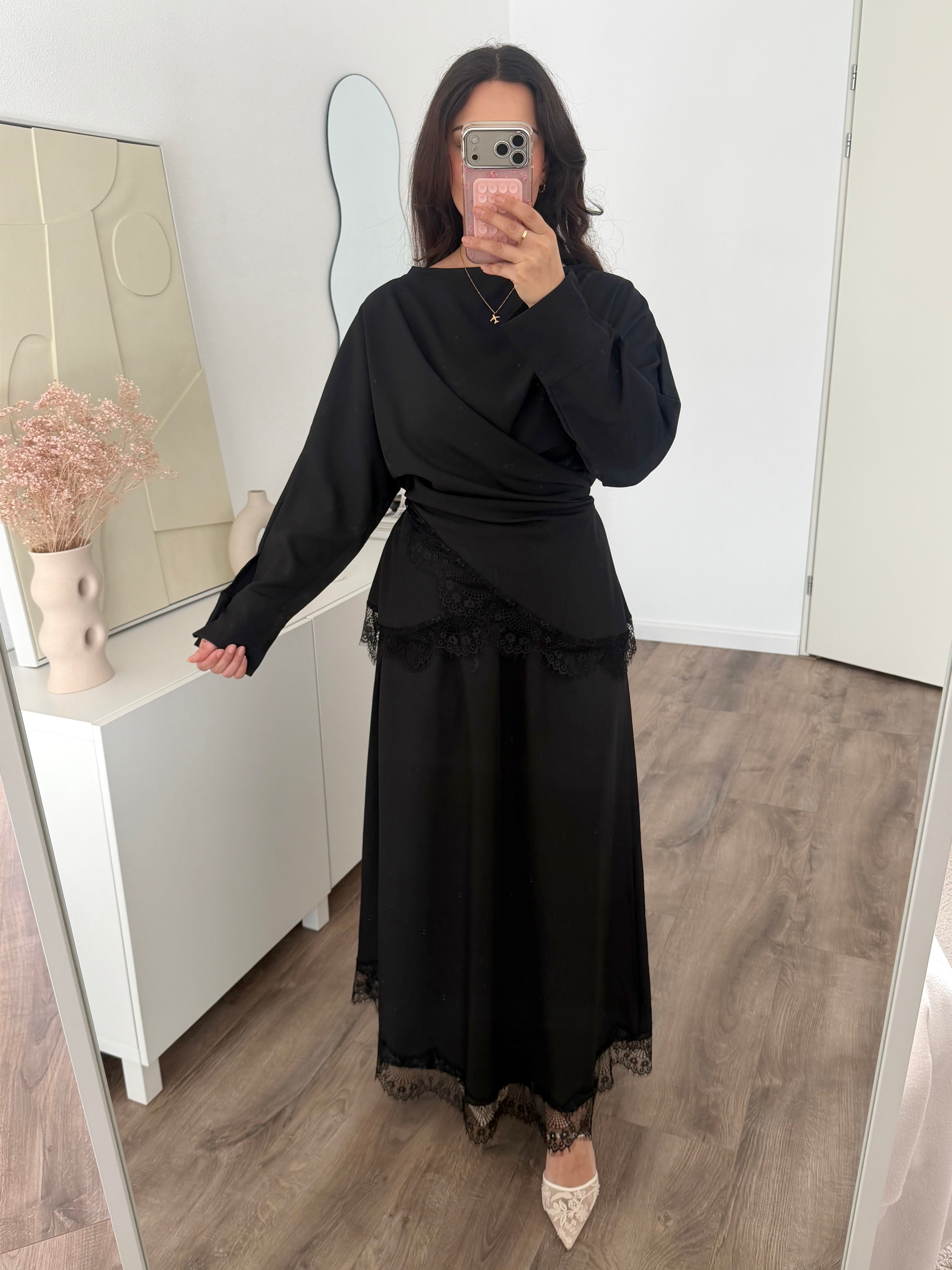 Een tweedelige set van fijne stofkwaliteit. De set schijnt niet door. Zowel de blouse als de rok hebben een mooie lace afwerking. De blouse is asymmetrisch en wordt vast gemaakt met koordjes aan de achterkant. Dit item is een one size maat en wordt aanbevolen van maat S(36) t/m XL(42). De set valt luchtig en de rok heeft een elastische taille. Hijabproof. Geschikt bij beginnende zwangerschap.