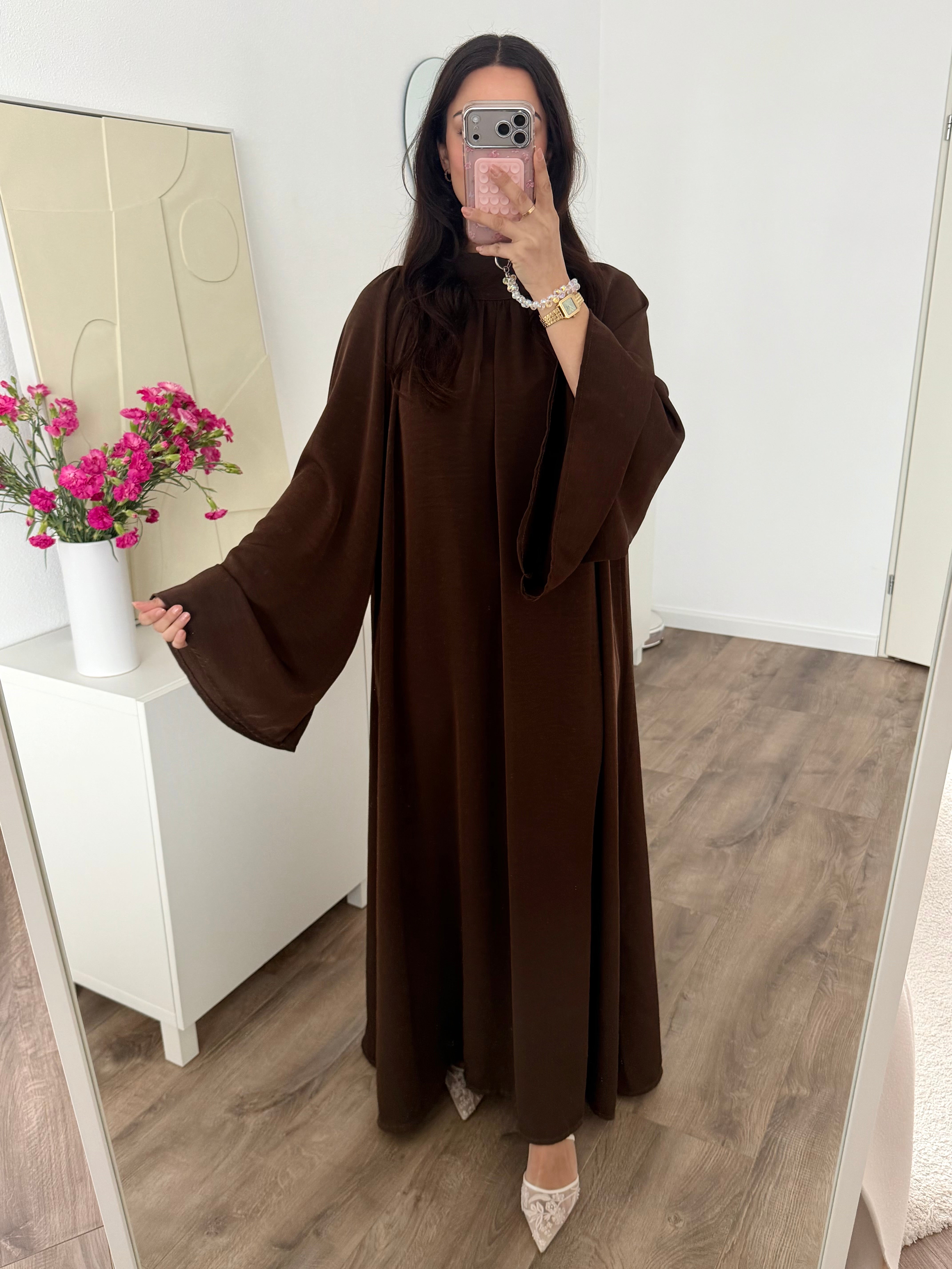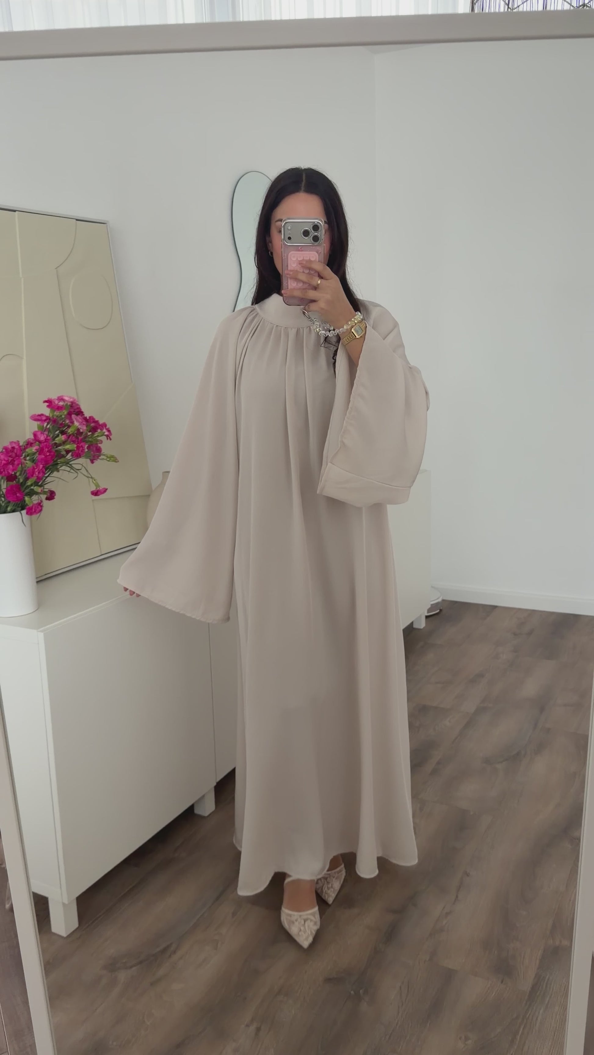 Ein langes Kleid aus feinem Stoffmaterial. Das Kleid ist blickdicht. Es hat einen Kragen und leichte Plisseefalten. Dieses Modell ist in Einheitsgröße erhältlich und wird für die Größen S(36) bis XL(42) empfohlen. Das Kleid fällt großzügig aus. Hijab-tauglich. Geeignet für Schwangerschaft.