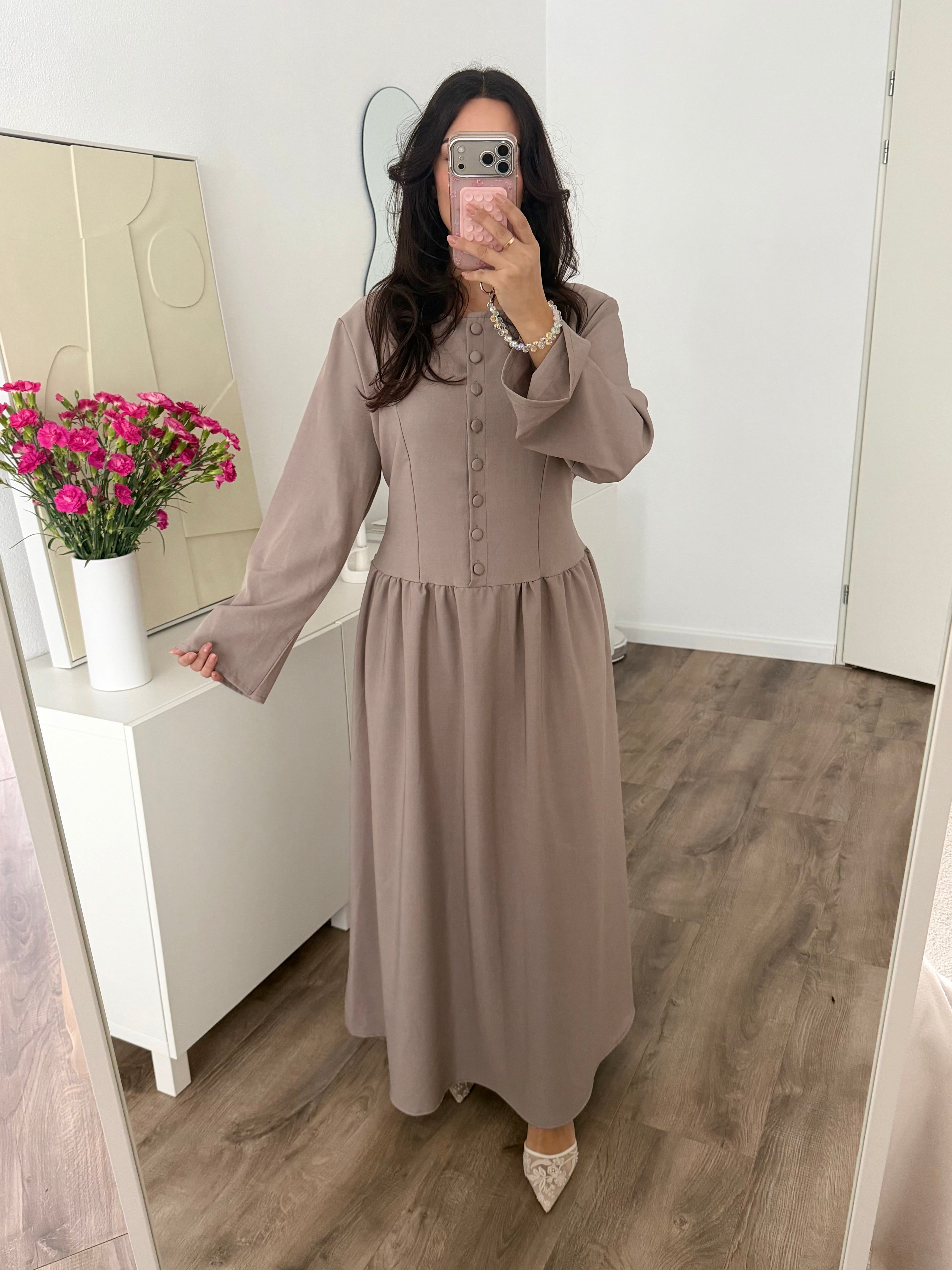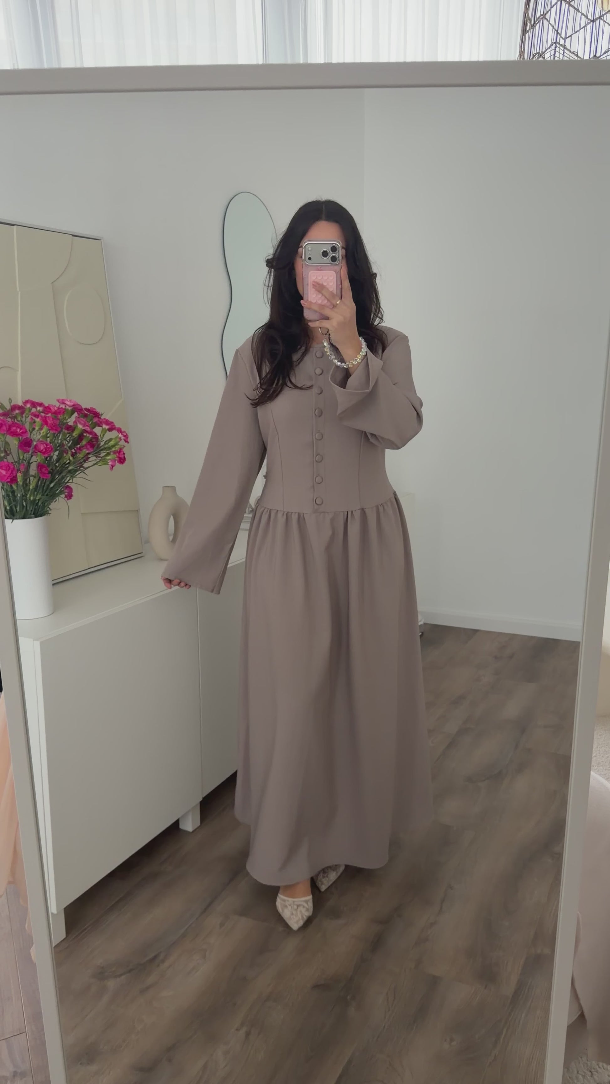 Ein langes Kleid aus feinem Stoff. Das Kleid ist blickdicht. Es hat dekorative Knöpfe vorne und Bändchen hinten, um die Taille zu betonen. Dieses Modell ist Einheitsgröße und wird für die Größen XS(34) bis XL(42) empfohlen. Hijab-tauglich. Geeignet für Schwangerschaft.