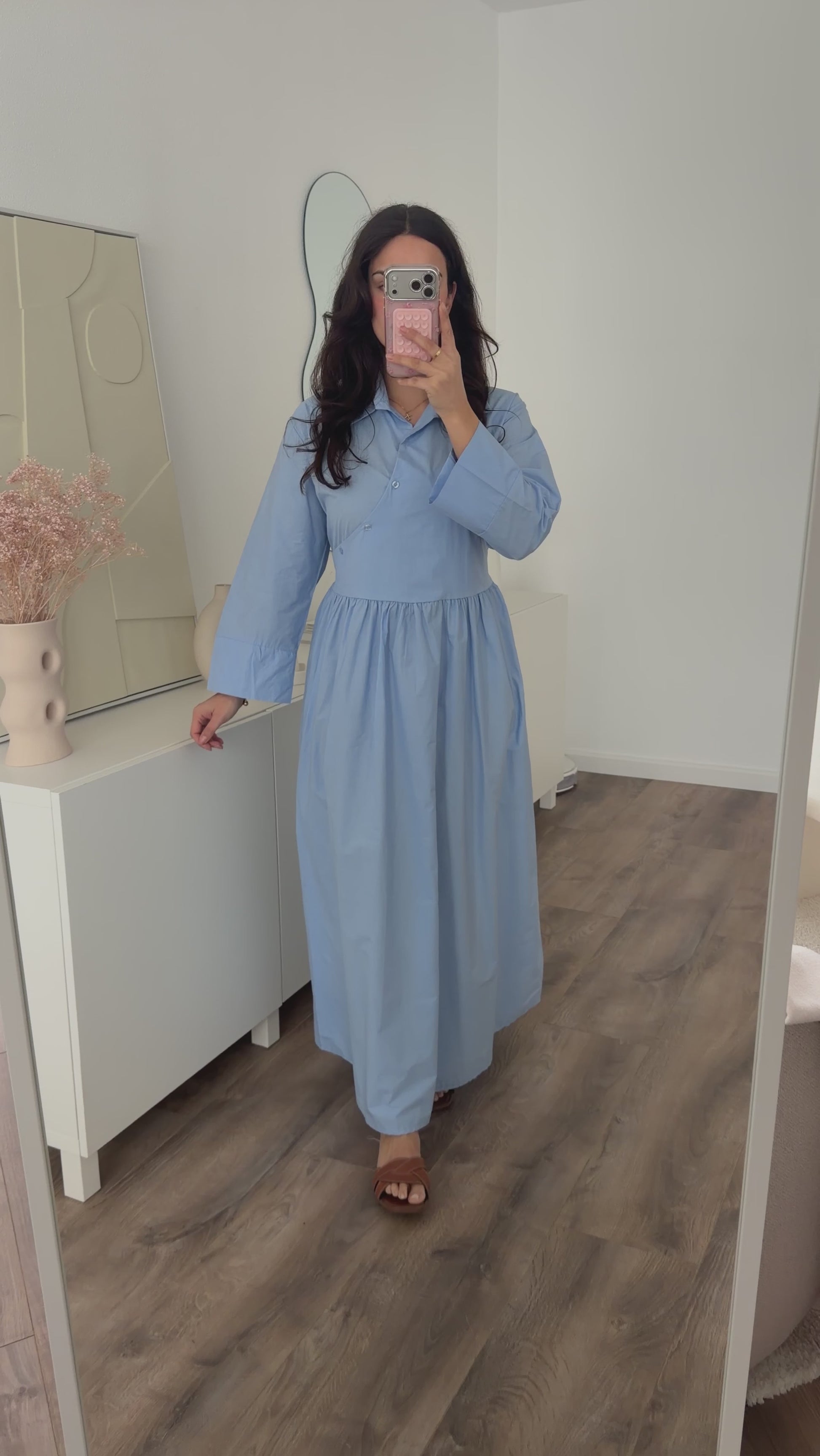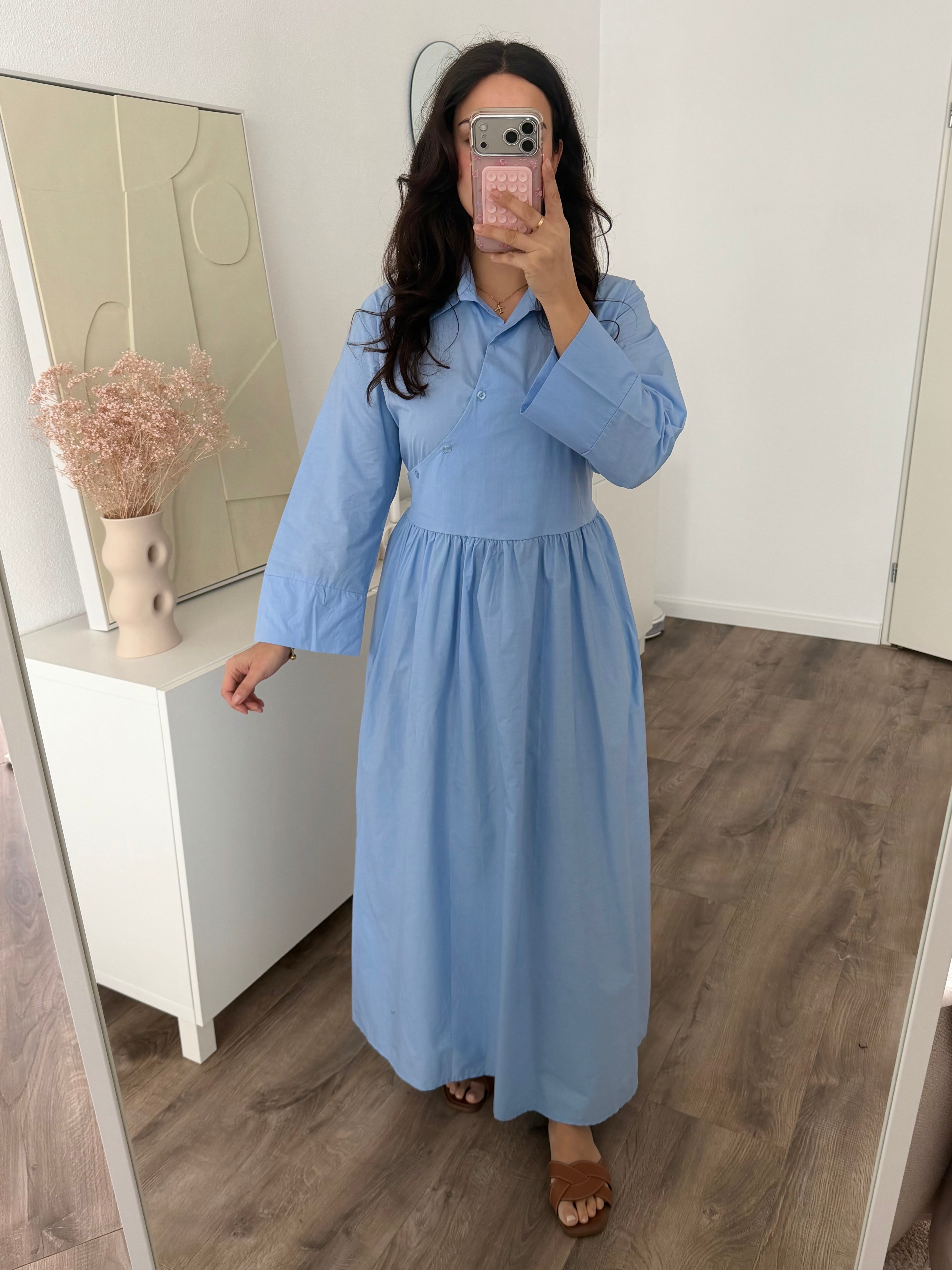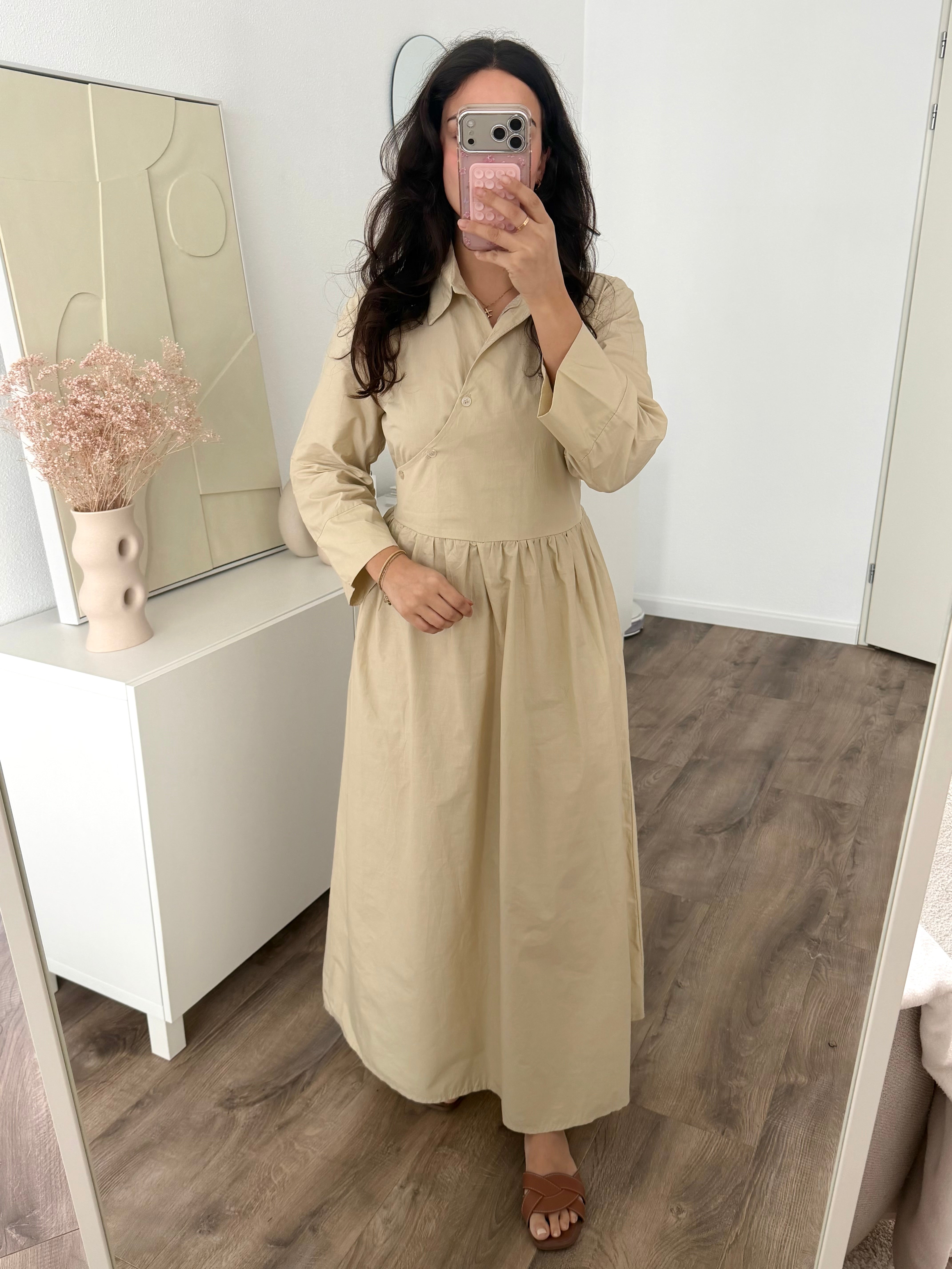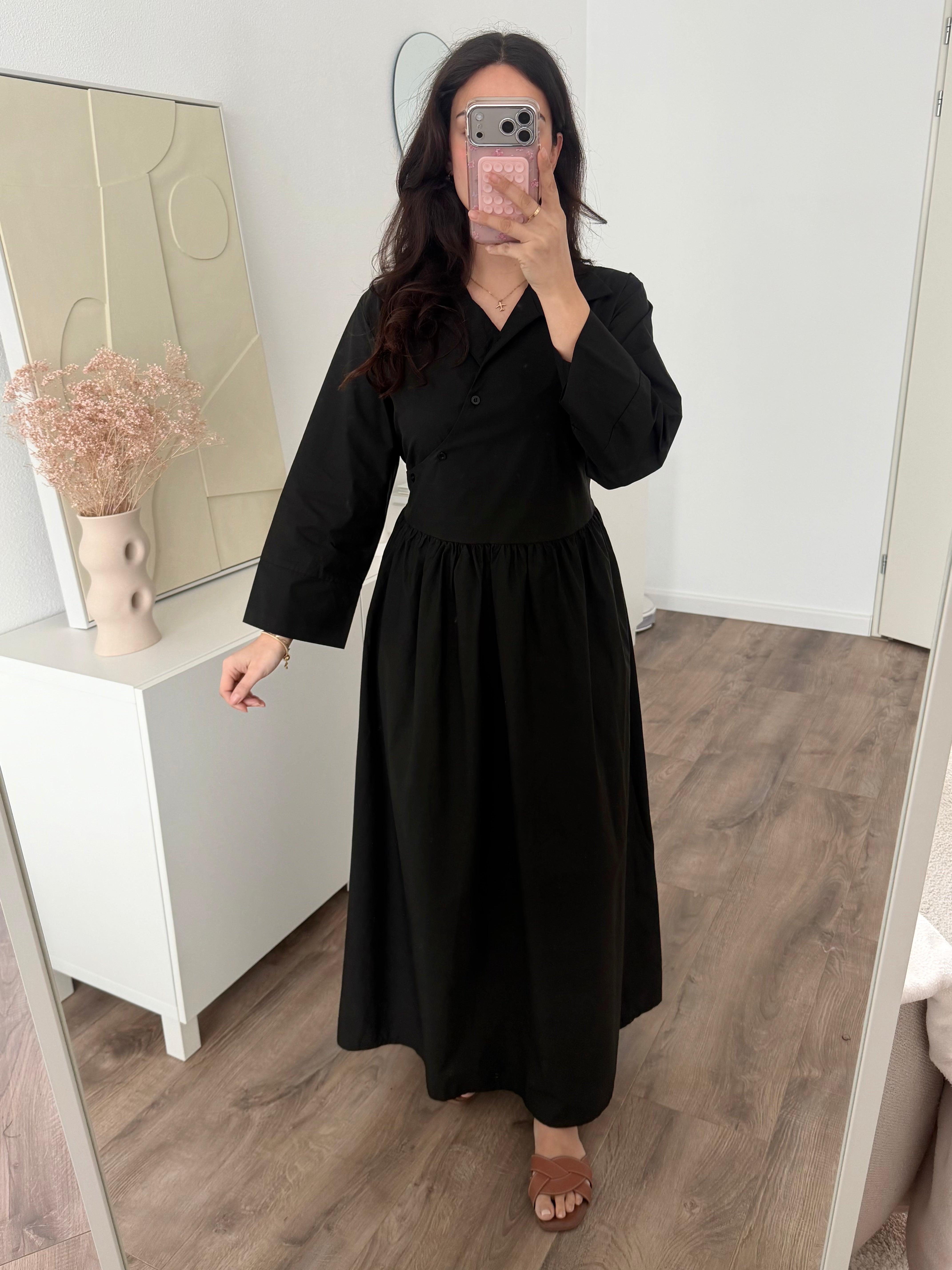 Een lange jurk van stevig stofmateriaal. De jurk schijnt niet door en sluit met knopen aan de voorkant. De jurk heeft koordjes die vast worden gemaakt aan de achterkant voor meer taille. Dit item is een kleine one size maat en wordt aanbevolen van maat XS(34) t/m L(40). Hijabproof. Geschikt bij zwangerschap.