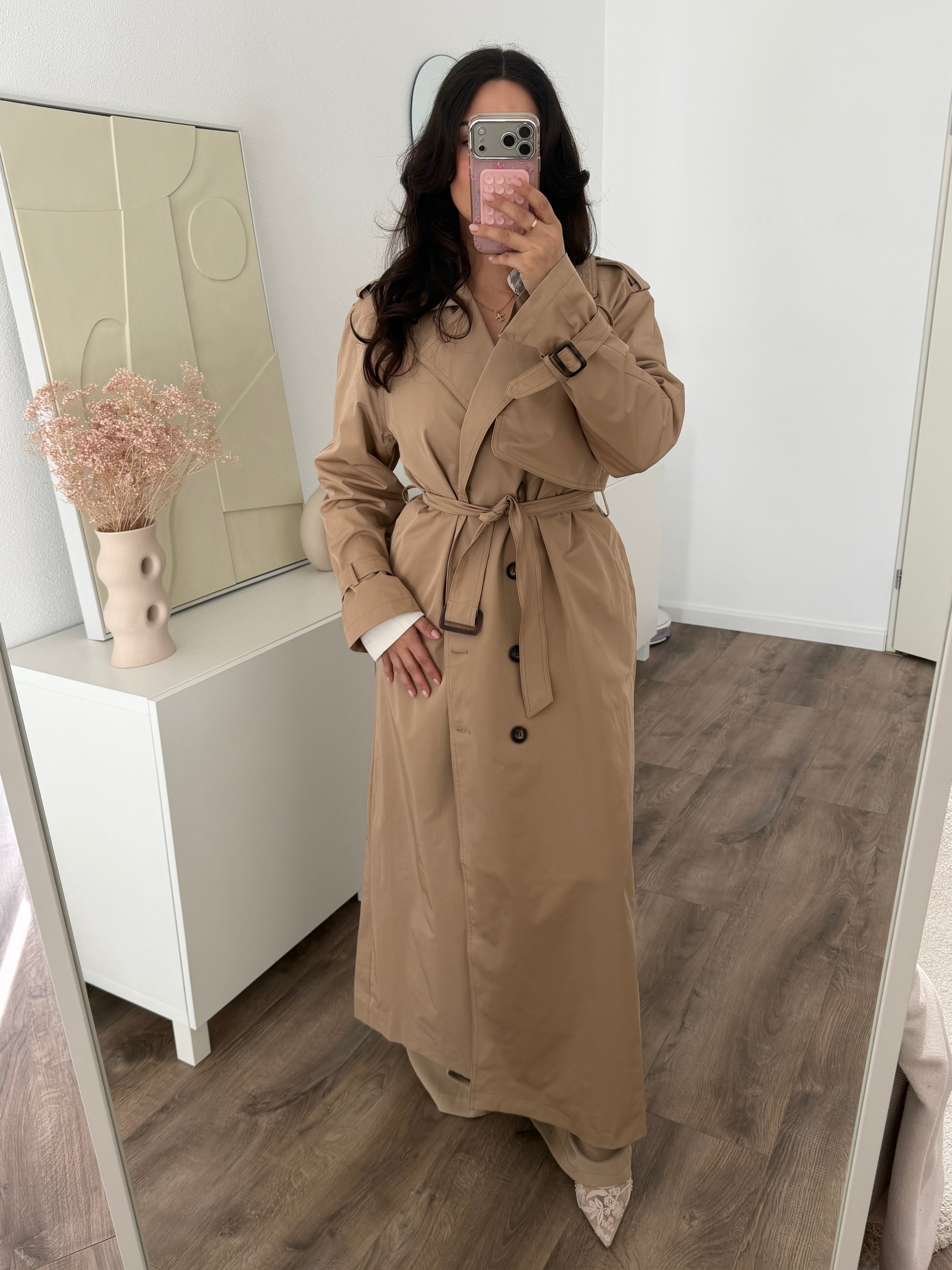 Een lange trenchcoat van stevig stofmateriaal. De trenchcoat schijnt niet door. De jas sluit met knopen aan de voorkant en heeft een riem. Aan de achterkant is een korte split die zorgt voor ruime beweging. De jas valt op maat.