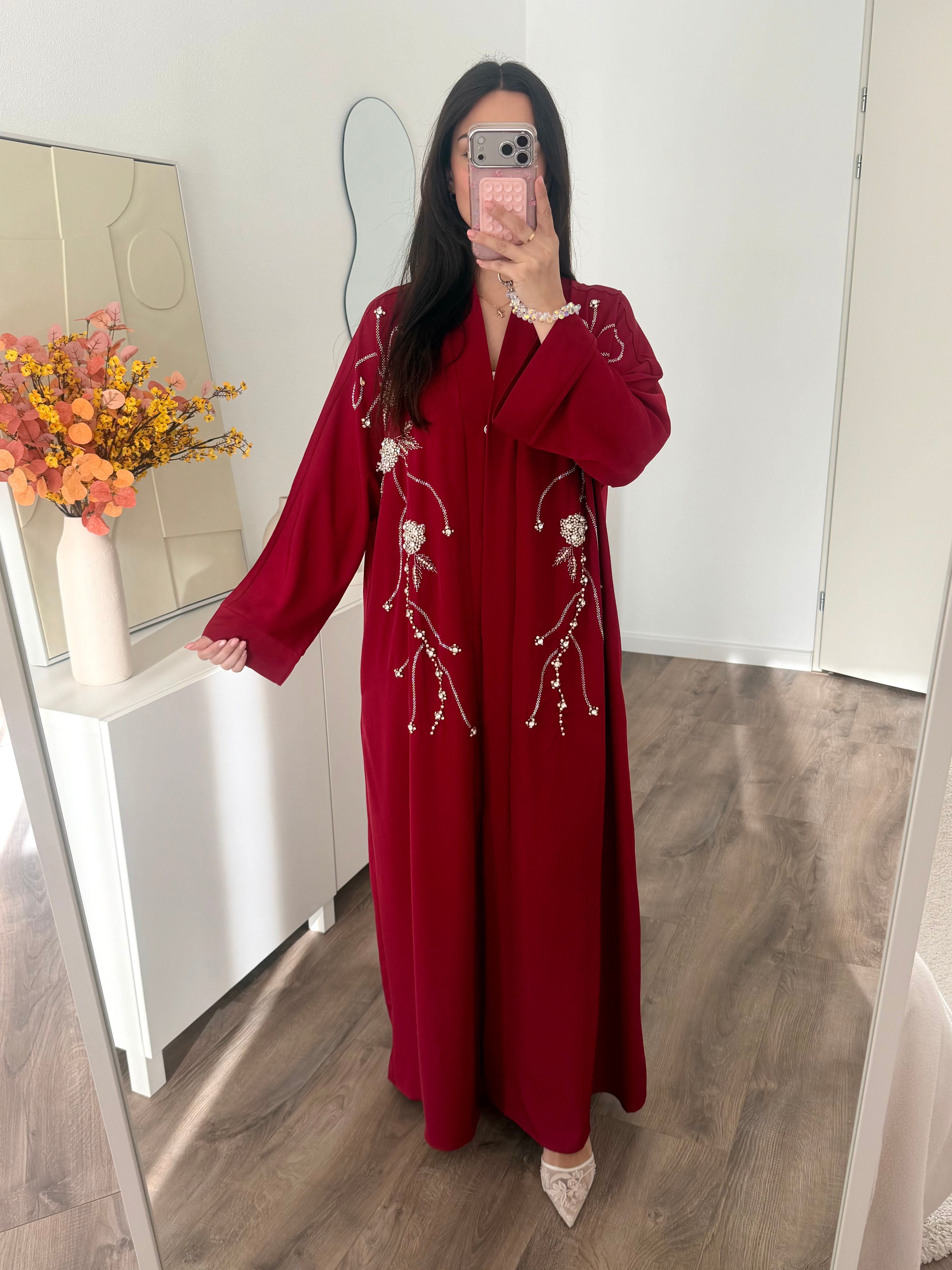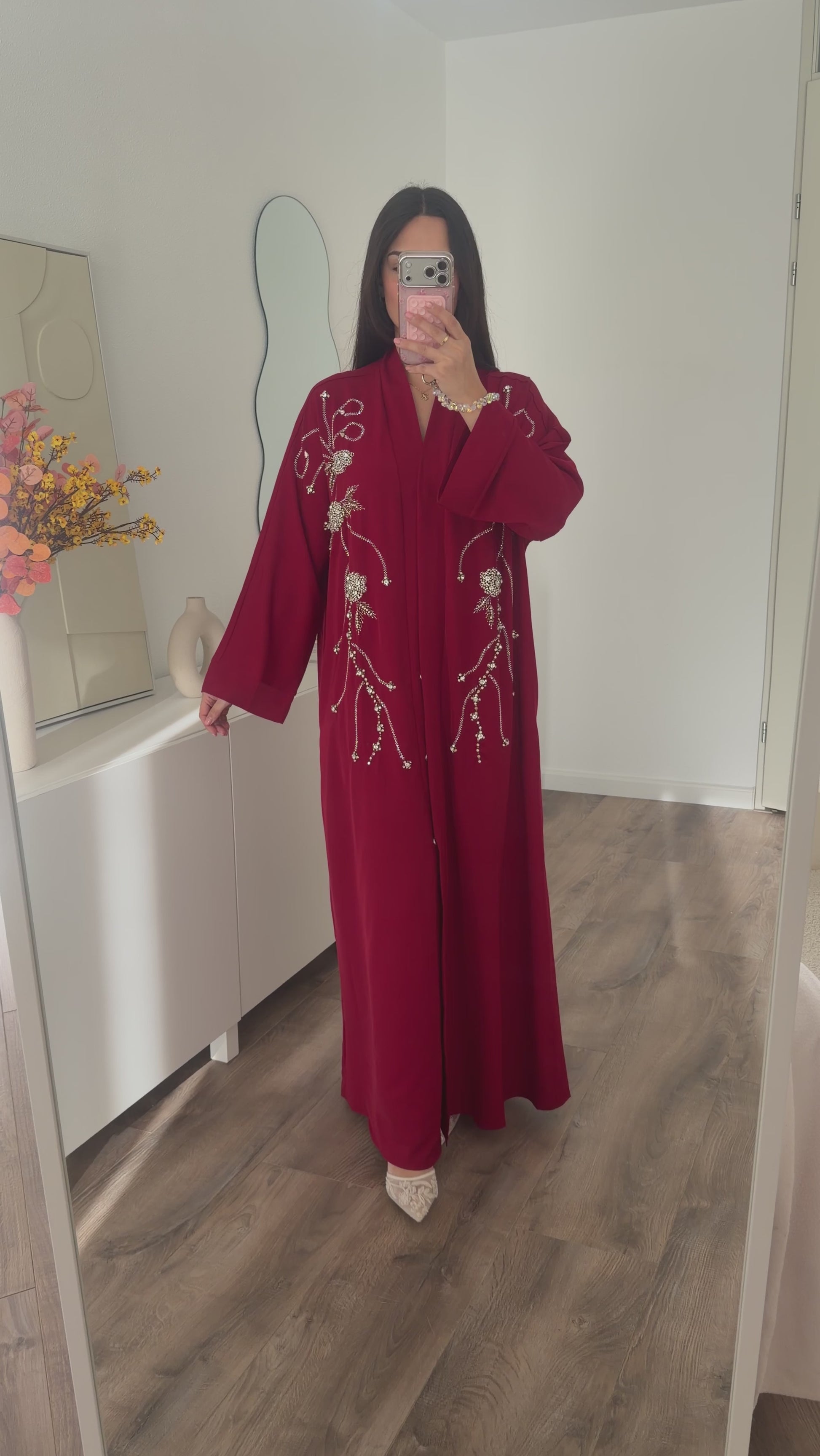 Una abaya larga de material fino. La abaya no es transparente y se cierra con botones en la parte delantera. La abaya tiene pequeñas piedras decorativas en la parte delantera. Esta prenda es amplia. Para una talla intermedia se recomienda una talla menor. Posiblemente adecuada para usar con hiyab. Apta para el embarazo. Atención a las instrucciones de lavado: lavado a mano debido a la composición delicada.