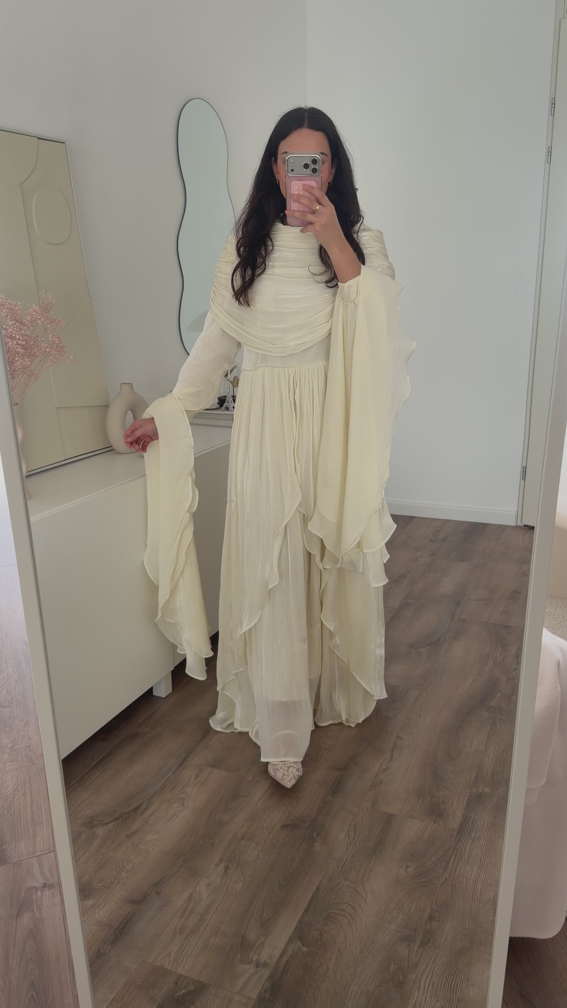 Een lange jurk met laagjes. De jurk schijnt niet door; neutrale kleur ondergoed is aanbevolen. De jurk heeft een katoenen onderjurk. De jurk heeft een losse ruffle die over de schouders heen kan. De jurk sluit met rits aan de achterkant. Dit item valt op maat en wijder vanaf de taille. Hijabproof. Eventueel geschikt bij zwangerschap.