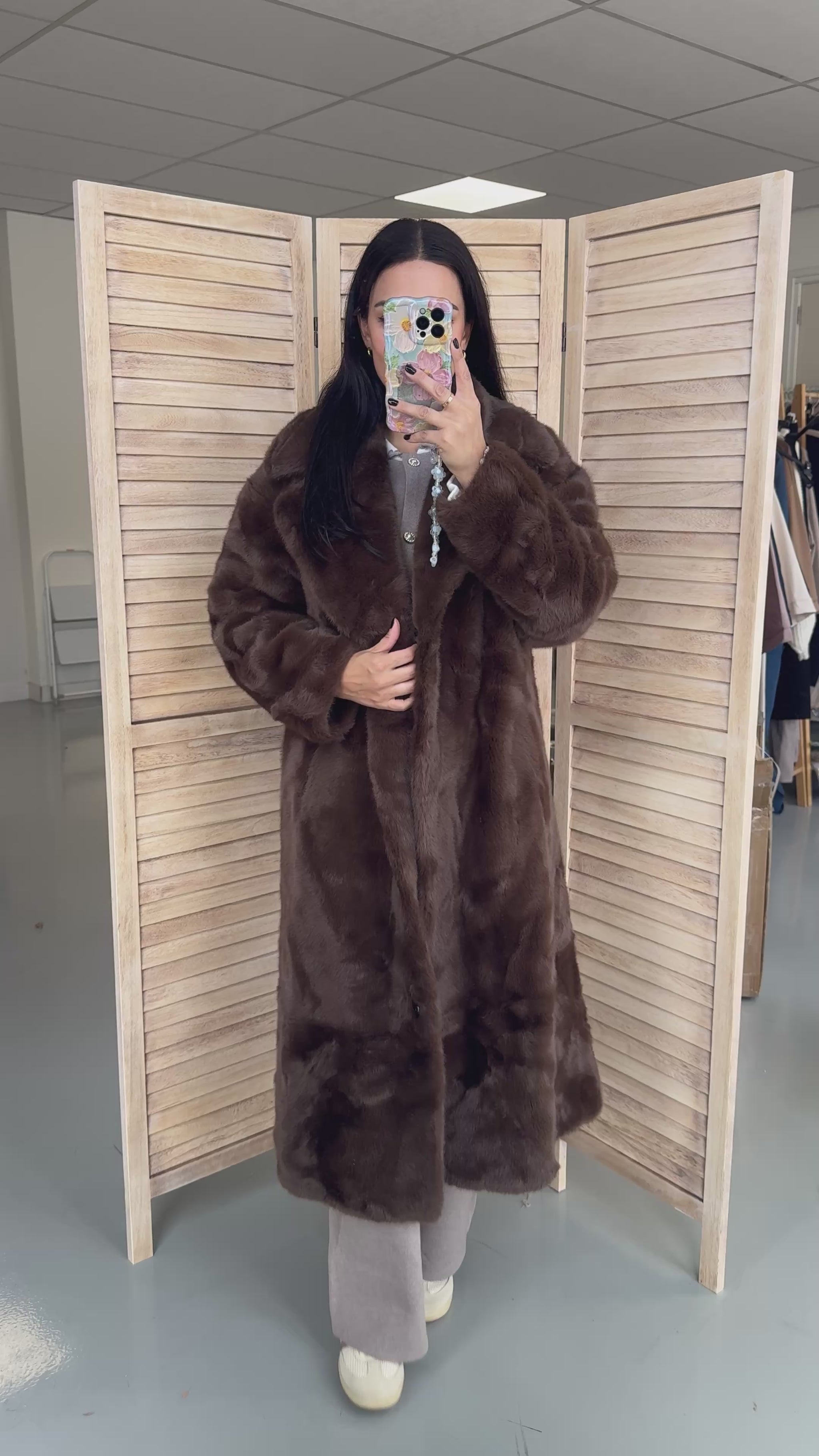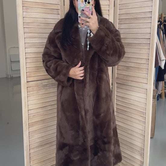 Een lange stevige jas met imitatiebont. Het bont voelt zacht aan. De binnenkant van de jas is van imitatieleer. De jas sluit met drukknopen. Dit item valt op maat.
