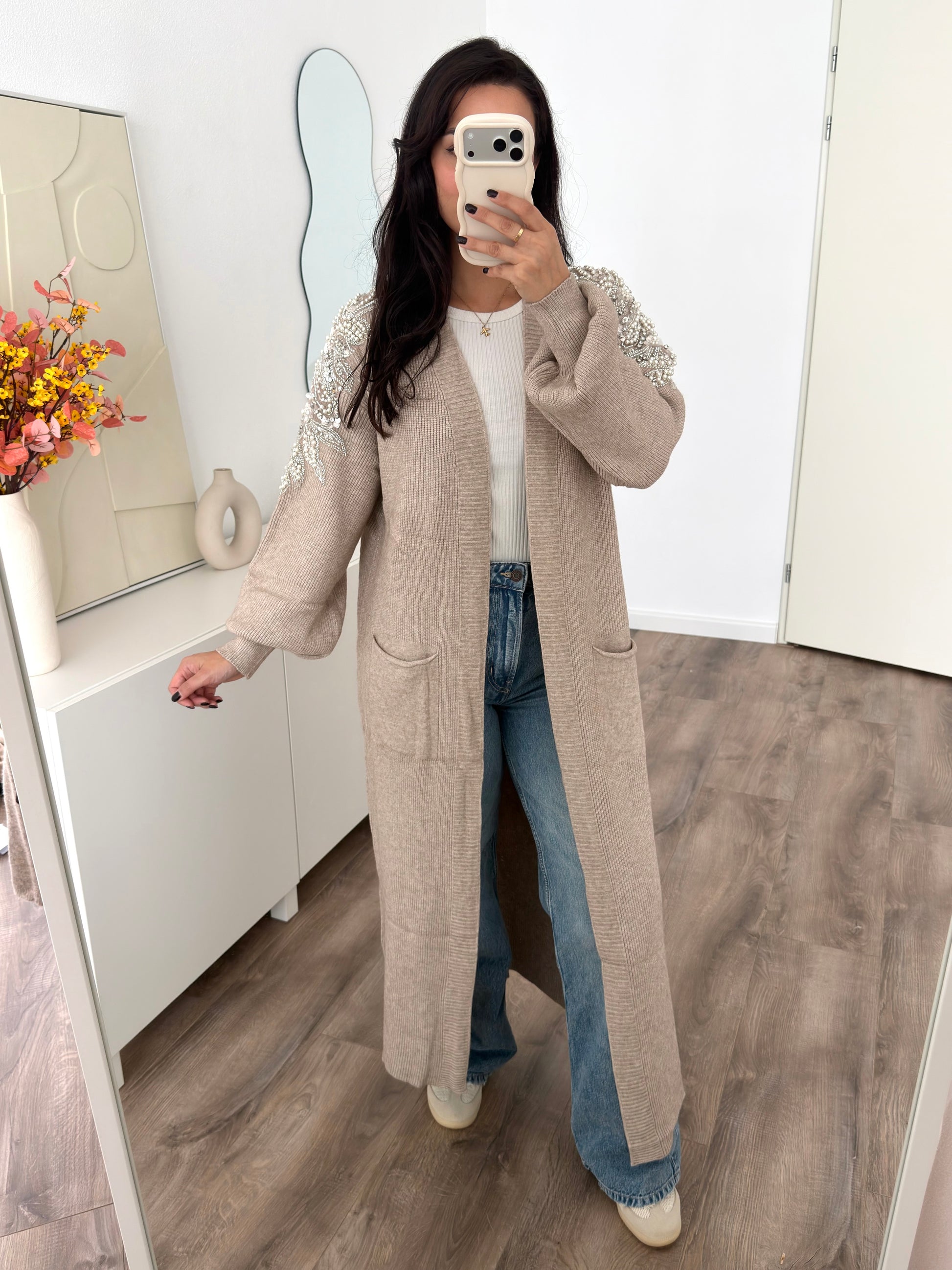 Een lang vest van gebreid stofmateriaal. Het vest schijnt niet door. Op de schouders zitten prachtige parels en kralen als extra detail. Dit item is een one size maat en wordt aanbevolen van maat S(36) t/m 3XL(46). Het vest valt ruim en rekt goed mee. Geschikt bij zwangerschap. Eventueel hijabproof.
