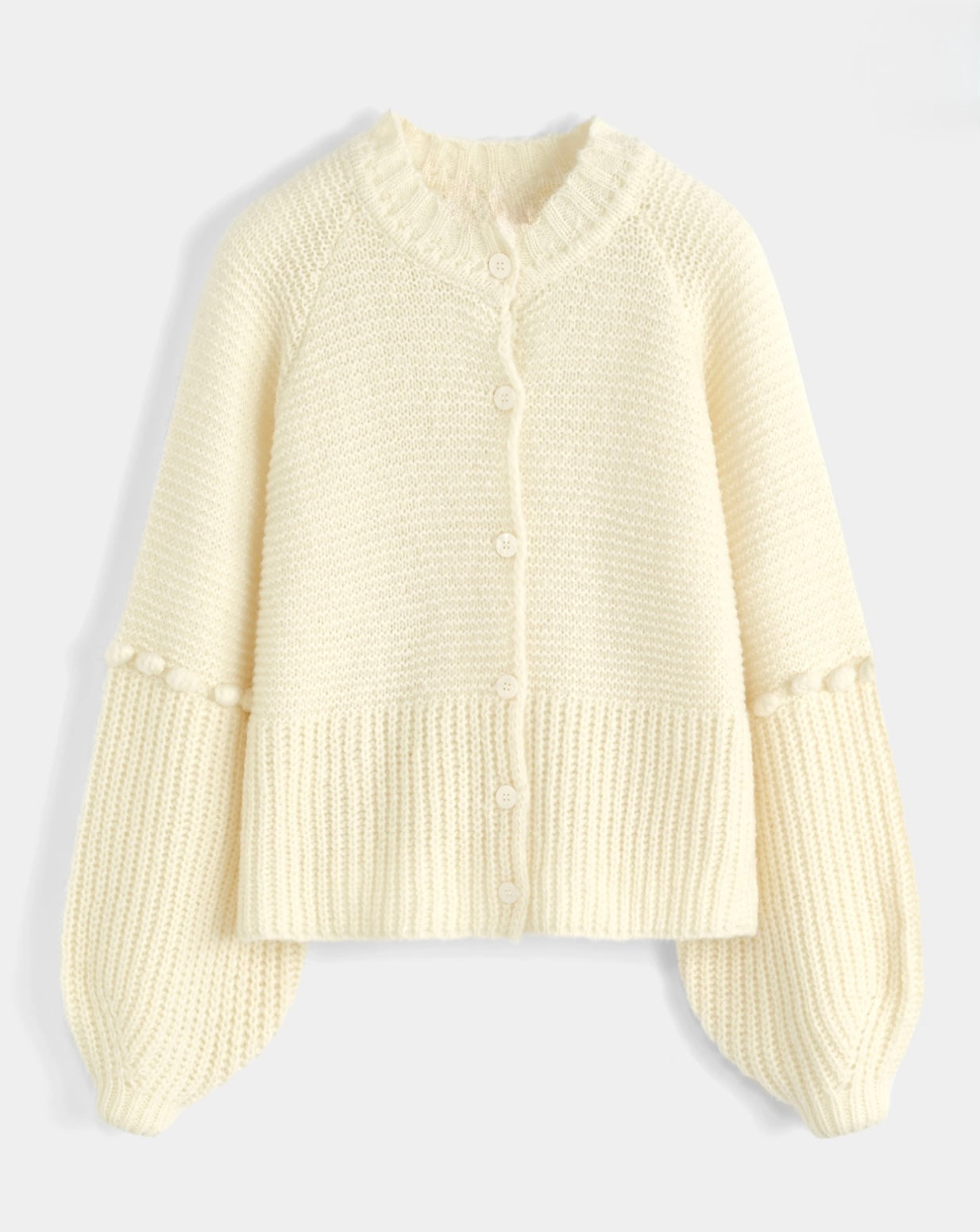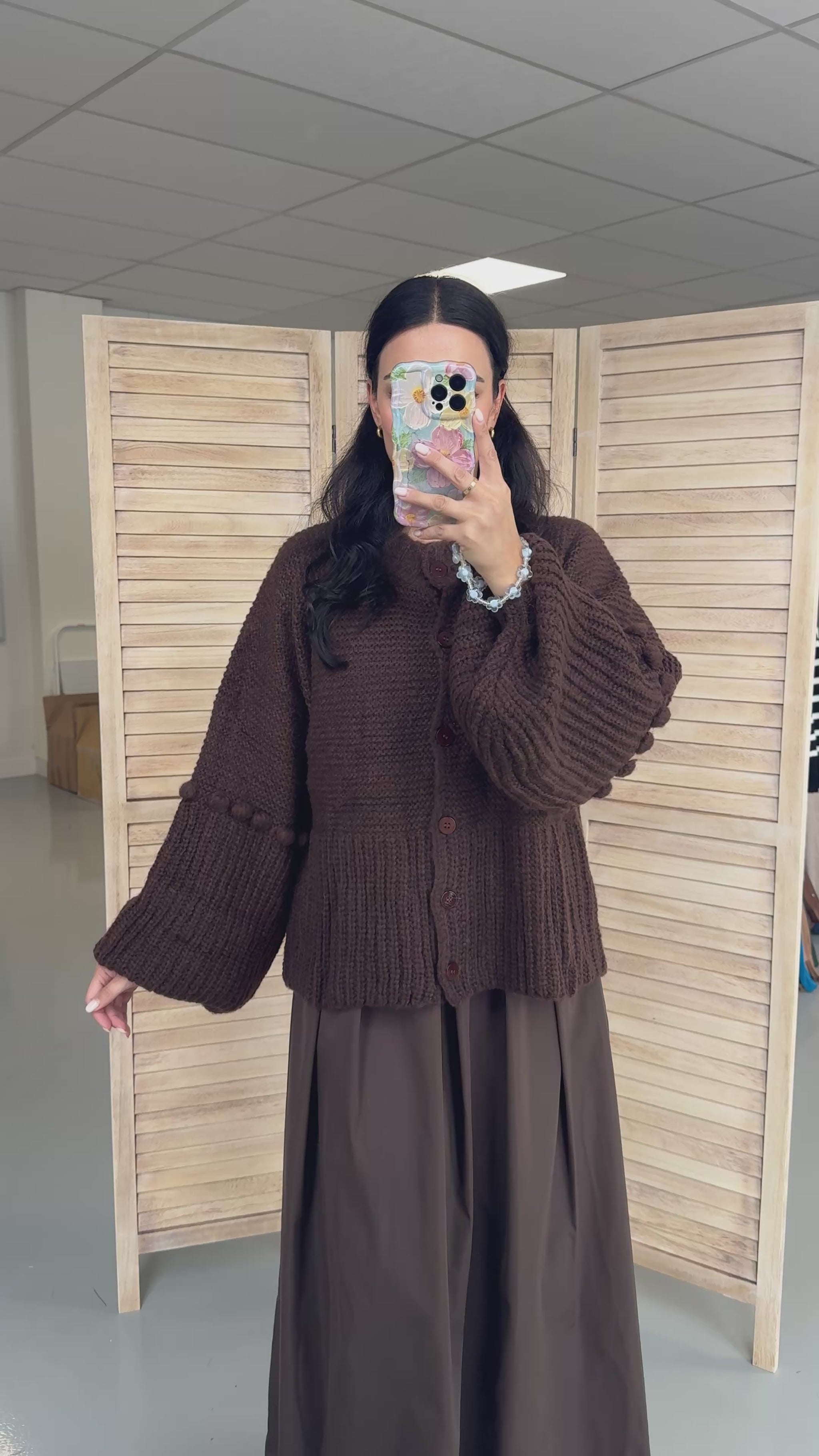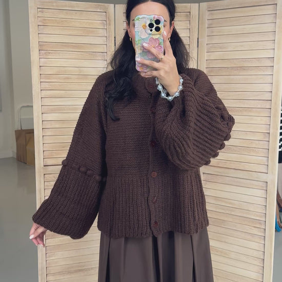 Een vest van gebreid materiaal. De mouwen hebben pompoms. Dit item is een one size maat en kan gedragen worden van maat XS(34) t/m XL(42). Het vest valt groter naarmate deze wordt gedragen vanwege het gebreid materiaal. Het vest valt mooi lang. Combineer het in of over de rok/pantalon!