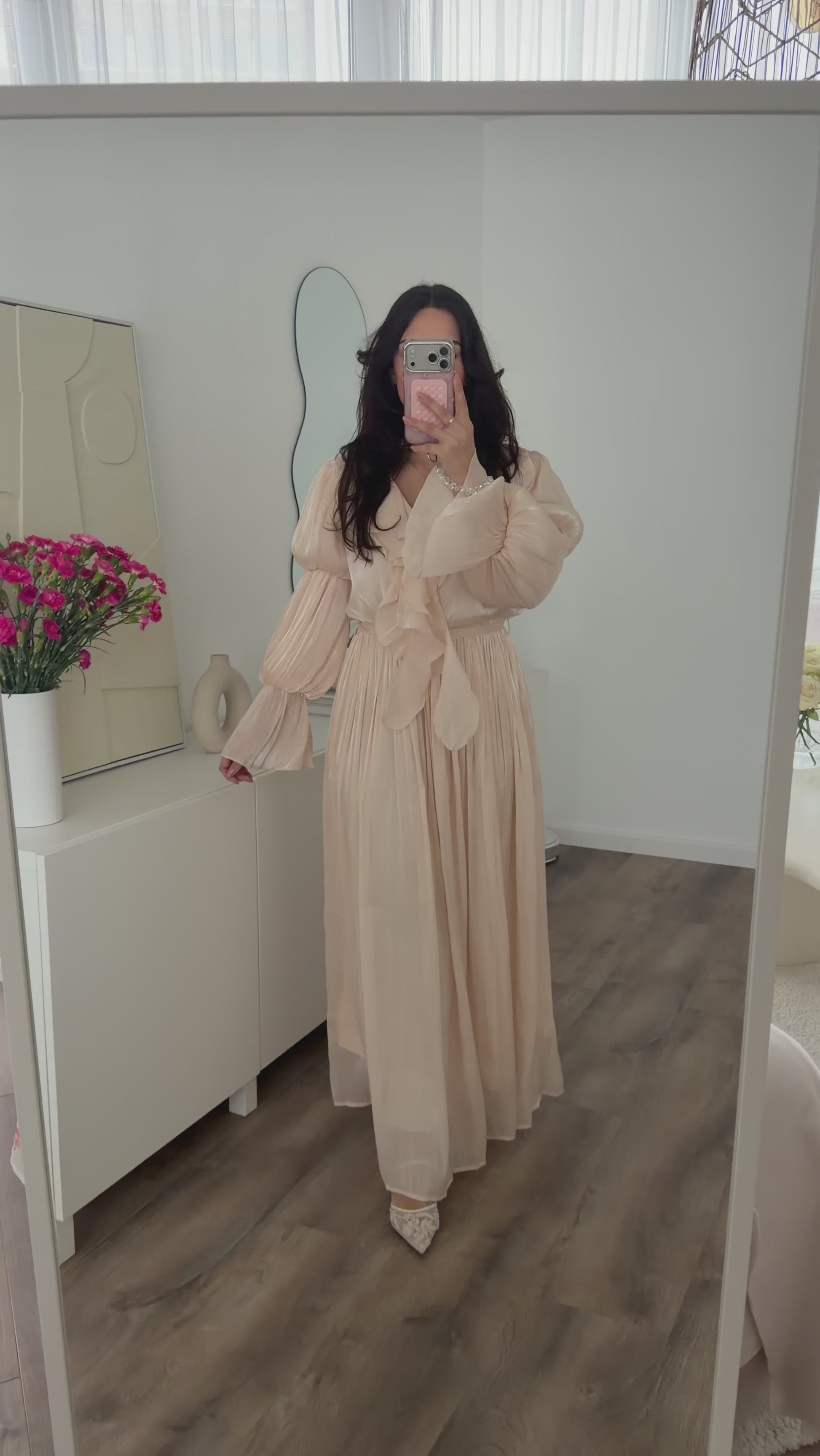 Une longue robe élégante avec des volants. La robe n'est pas transparente et possède un décolleté en V mi-bas ainsi qu'une jupe intérieure. Le col et les manches donnent à la robe un aspect festif. Cet article taille normalement et a une taille élastique. Éventuellement compatible hijab. Convient pendant la grossesse.