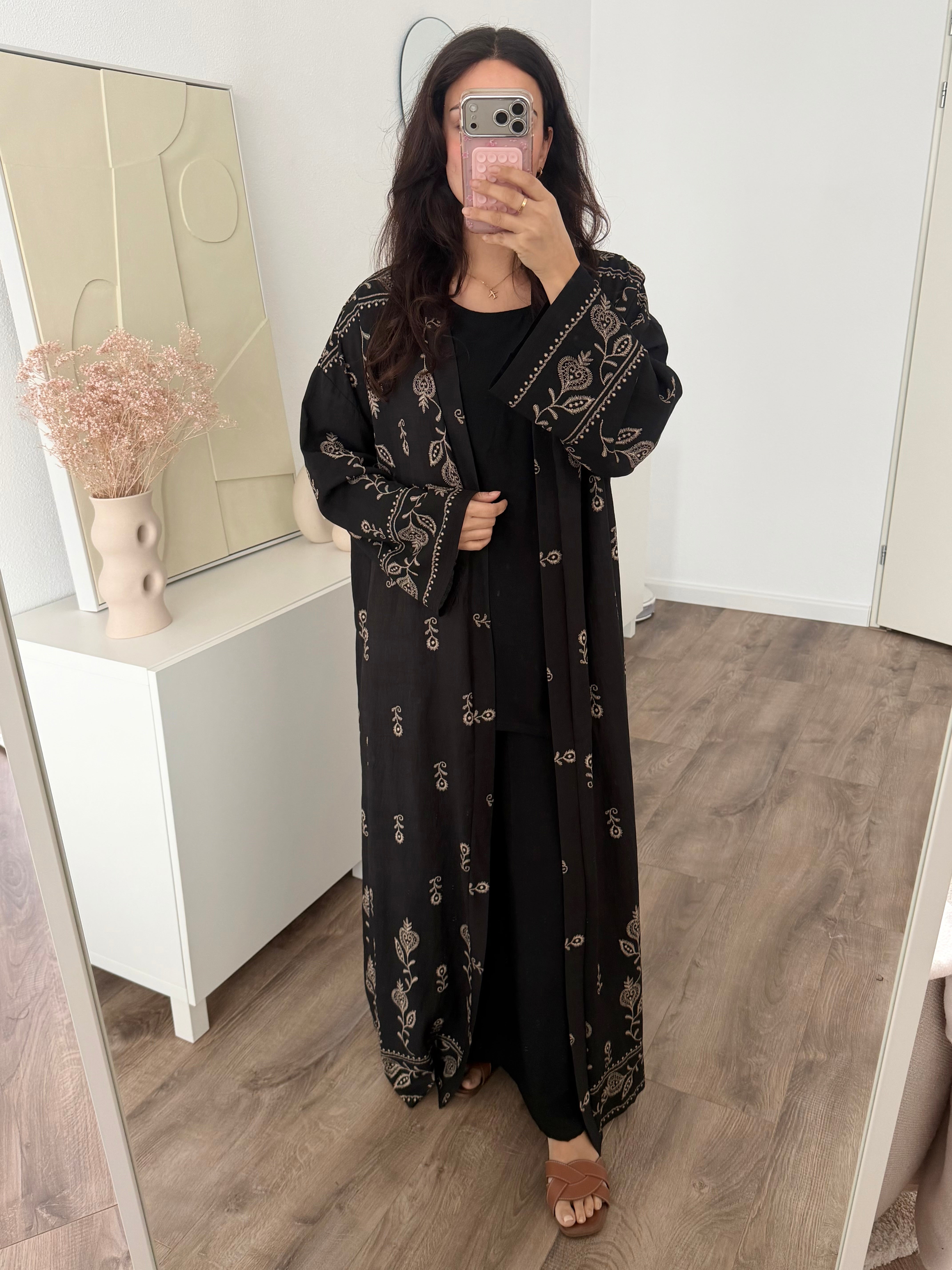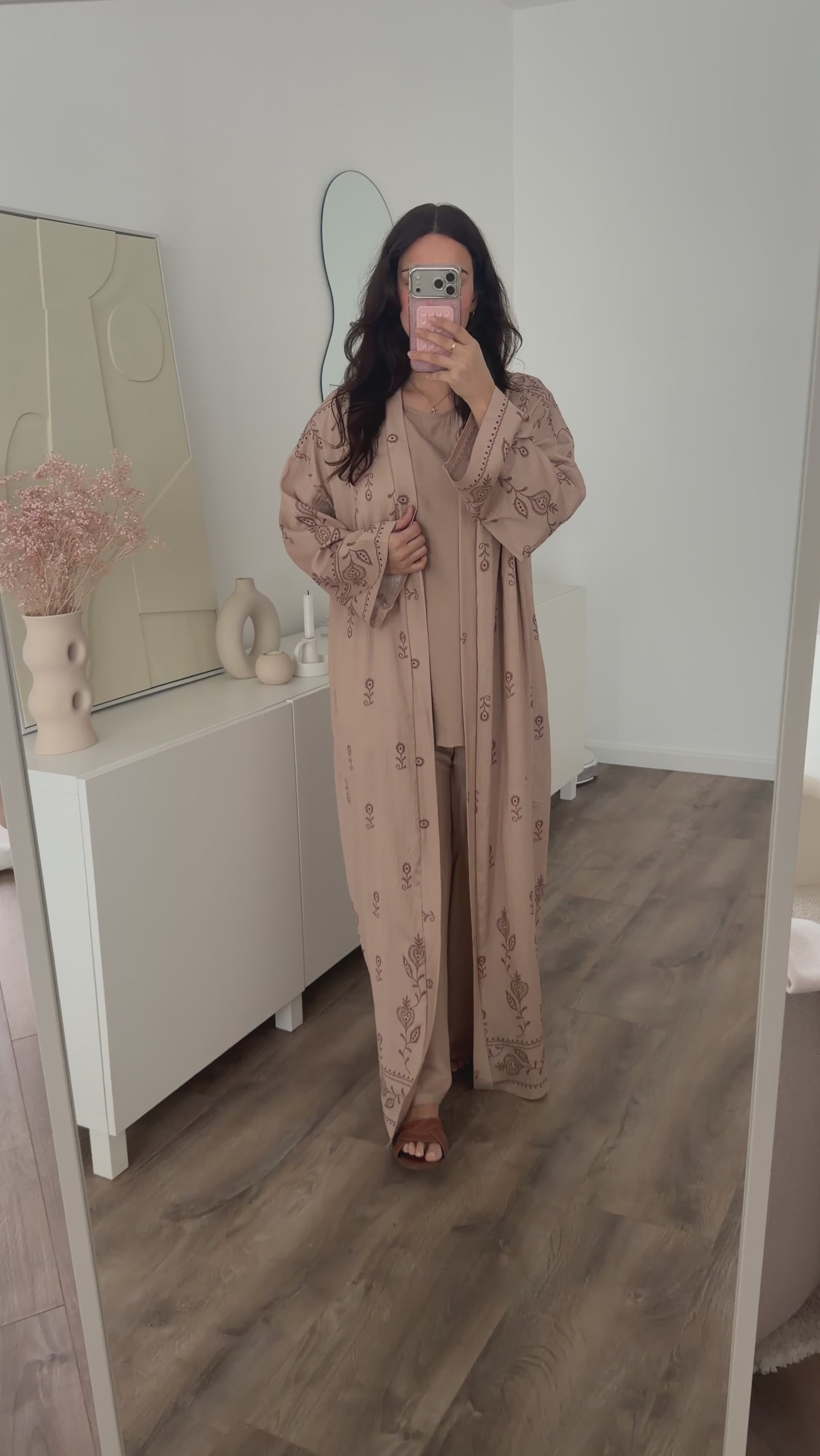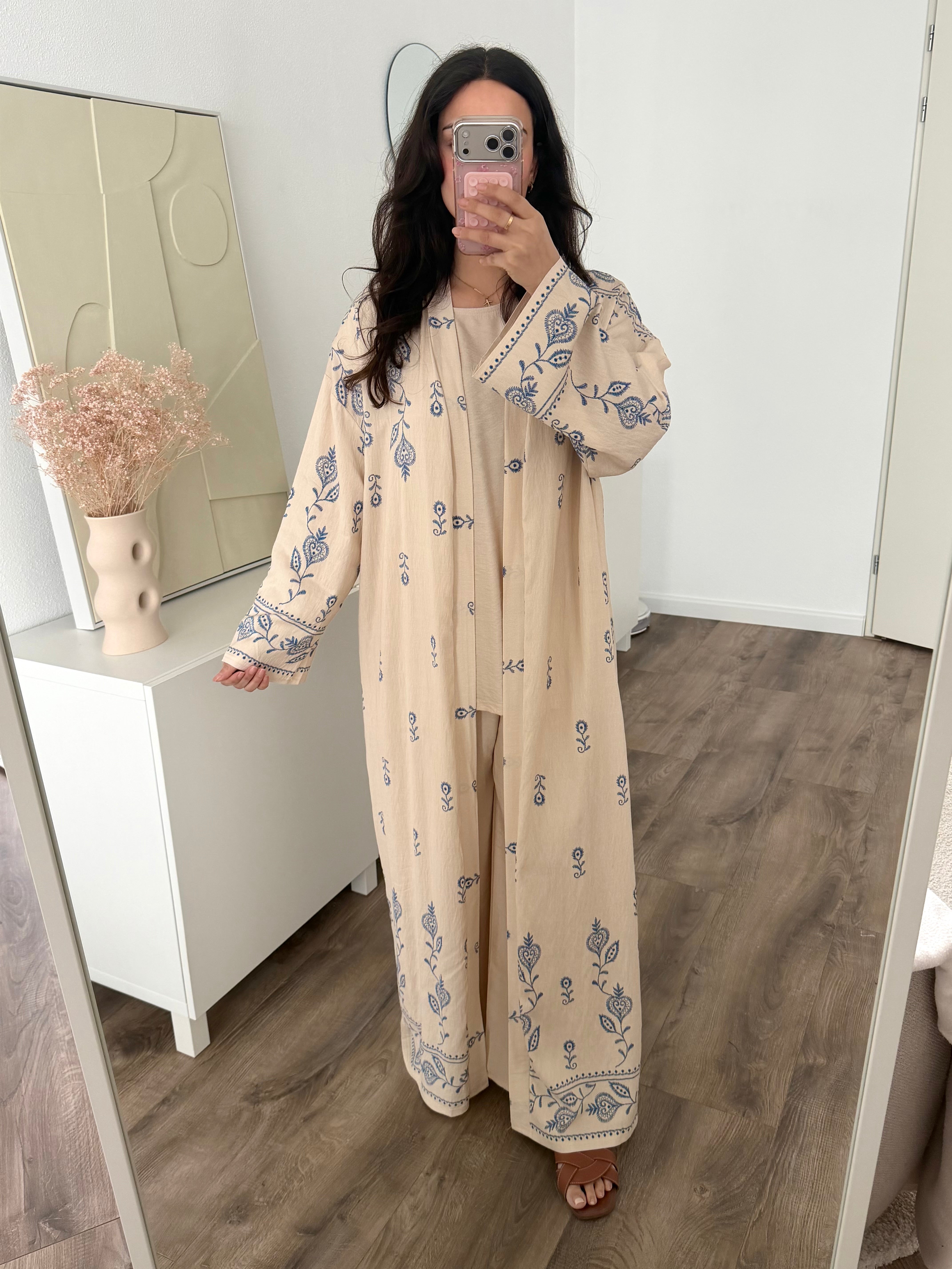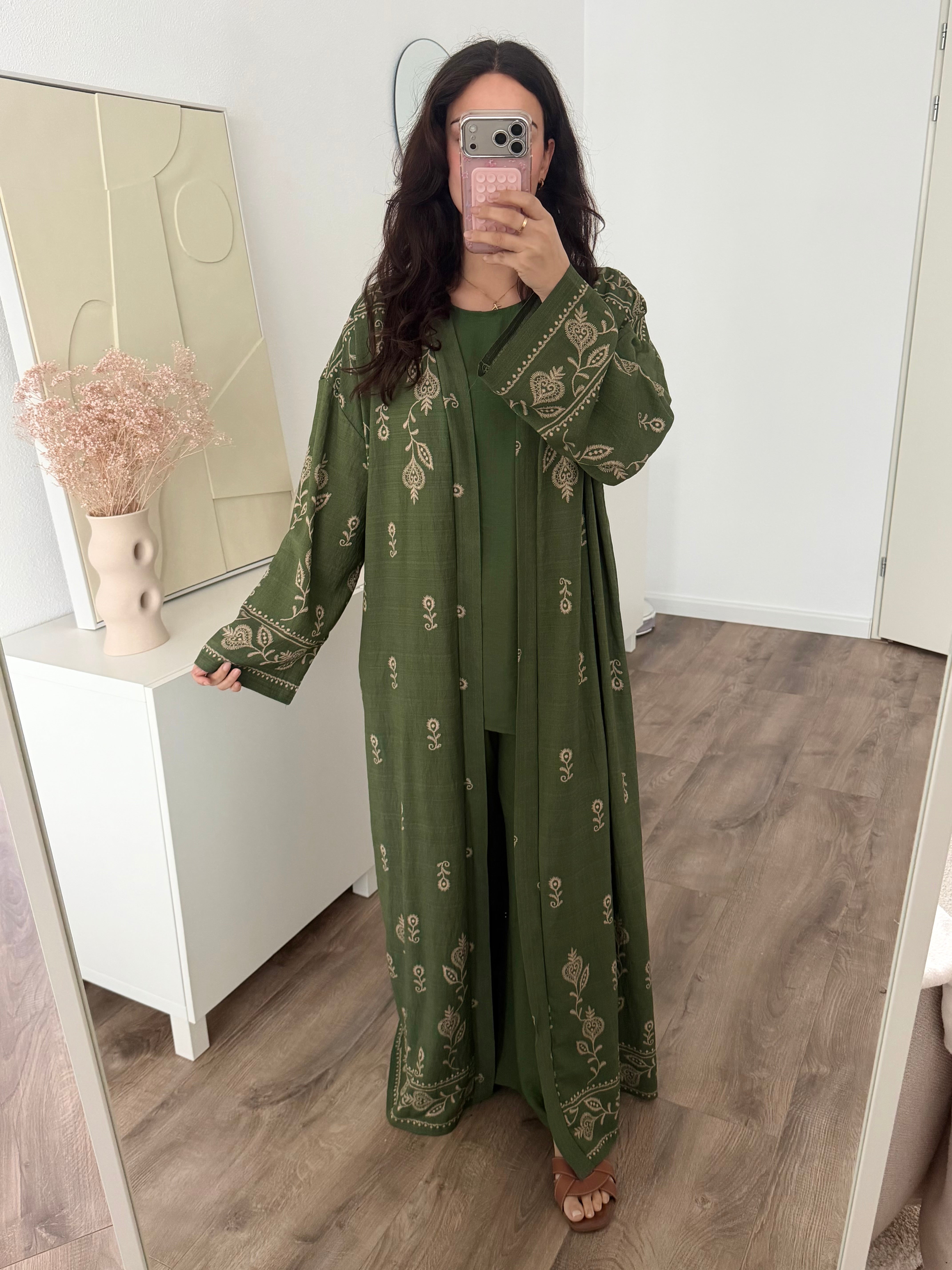 Een 3-delige set bestaande uit t-shirt, broek en kimono van fijne stofkwaliteit. De set schijnt niet door. Dit item valt ruim en wordt aanbevolen van maat S(36) t/m L/XL(40/42). De broek heeft een elastische taille. Hijabproof.