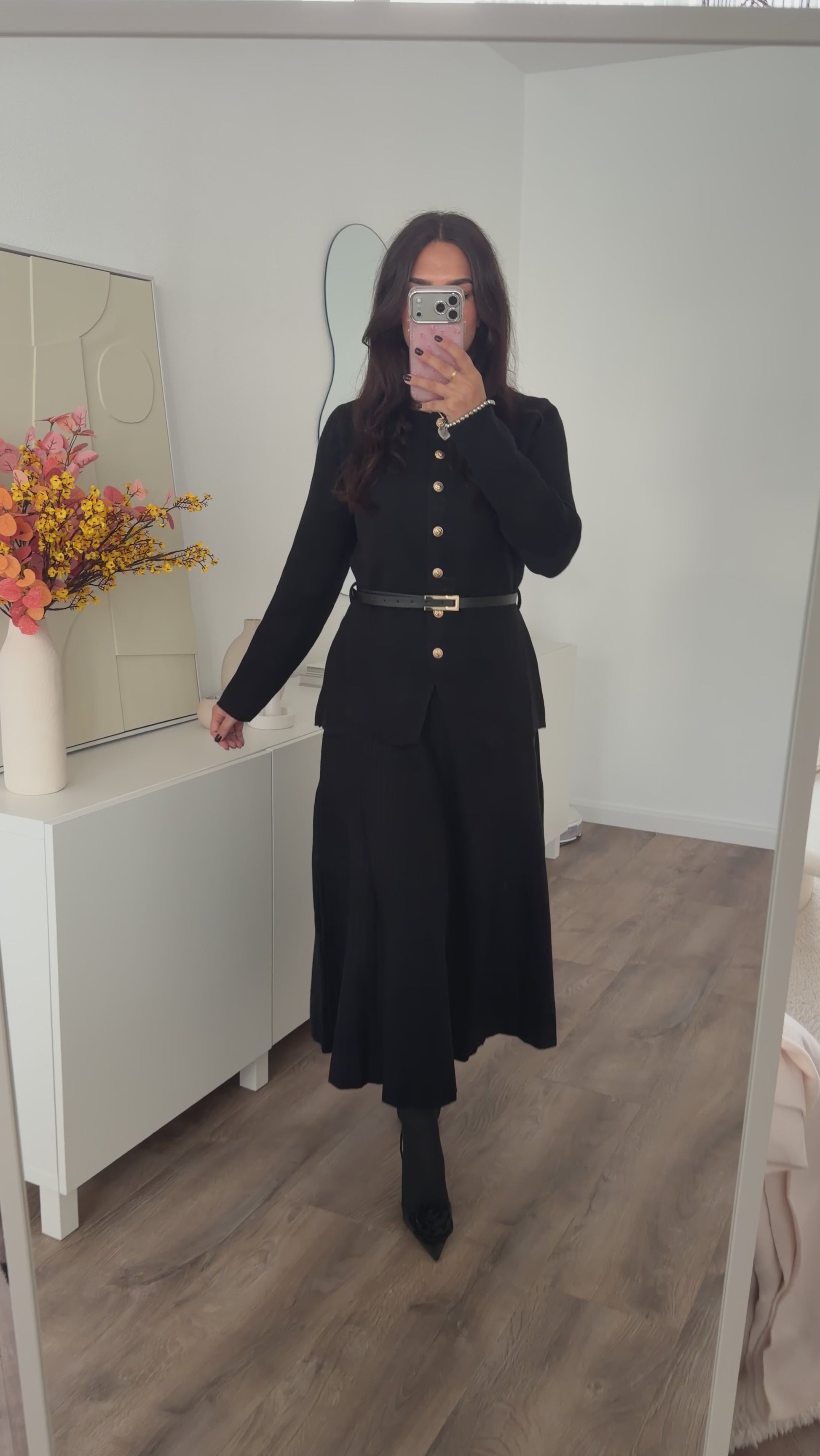 Een tweedelige set van hele fijne zachte stofkwaliteit. De set schijnt niet door. De knopen op de trui en bijbehorende riem geven de set een mooi detail. Dit item valt op maat. De stof rekt mee. Eventueel hijabproof.