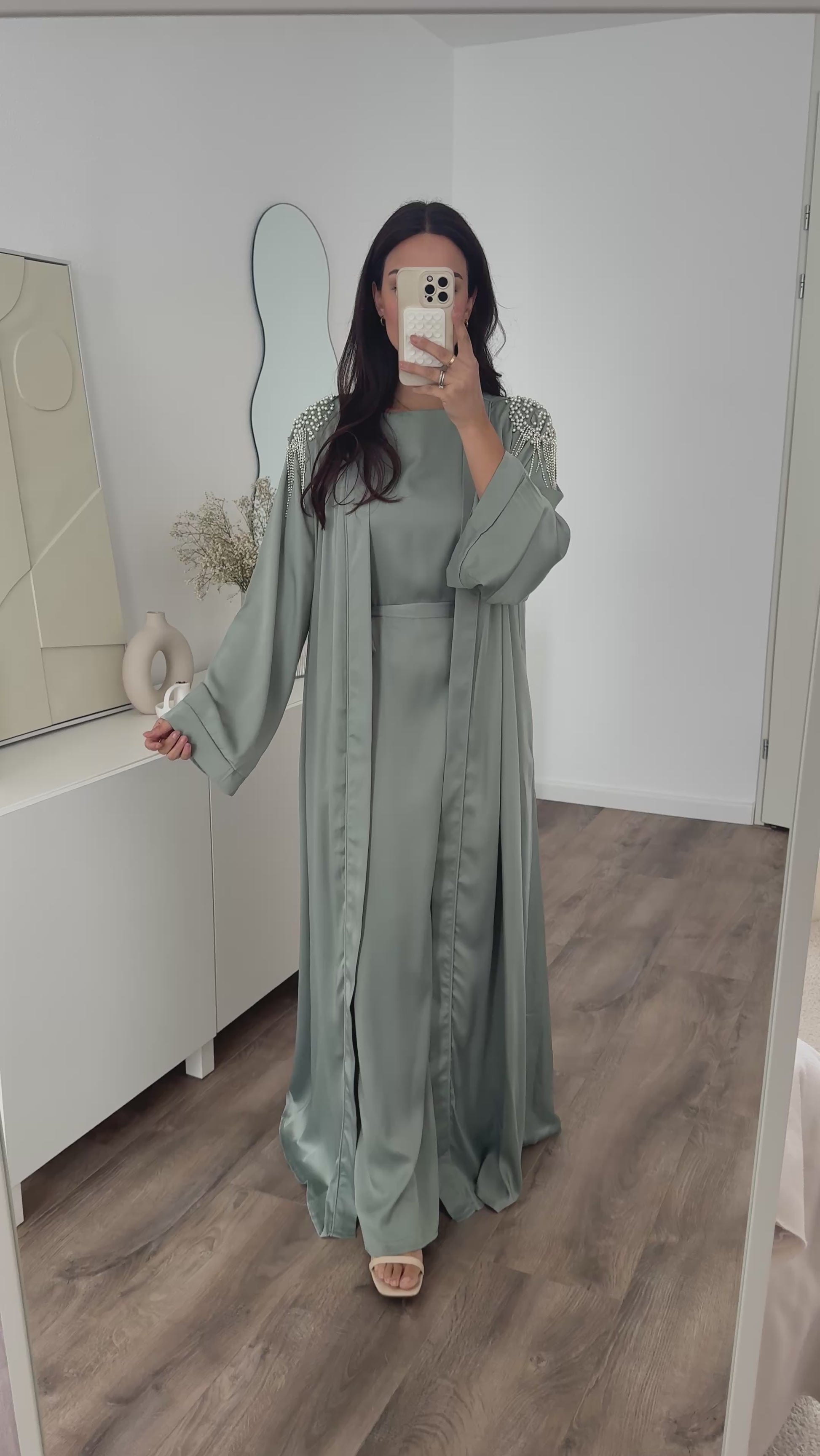 Een abaya set bestaande uit een onderjurk met riem en kimono. De set schijnt niet door. De onderjurk is mouwloos. De kimono heeft karel en parels(handle with care). Ook te dragen zonder riem. Dit item valt ruim. Heb je een tussenmaat? Neem dan een maat kleiner. Geschikt voor zwangerschap. Hijabproof.